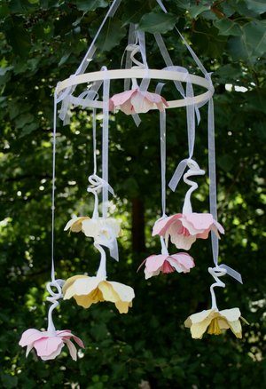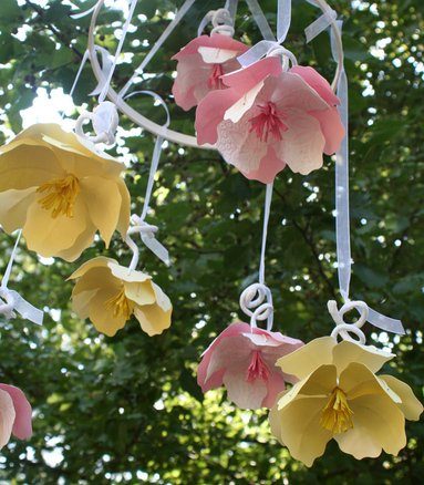 Schaut mal, so fröhlich kann die Tischdeko zur Taufe aussehen. Ich habe die Farben der Blumen aufgegriffen und mit bunten Papierblumen ergänzt.
