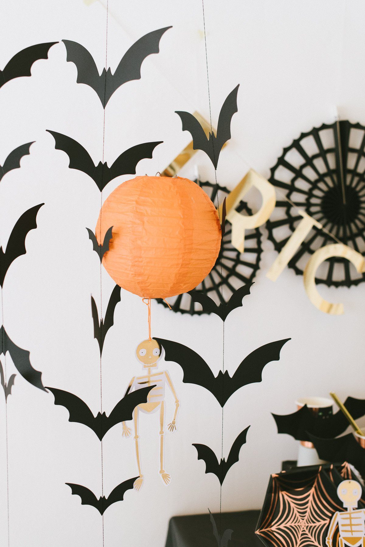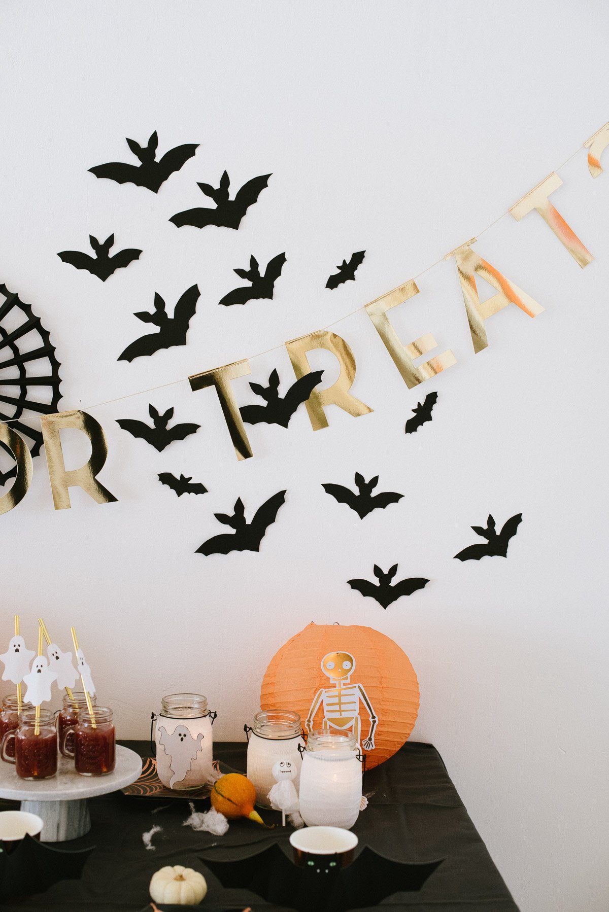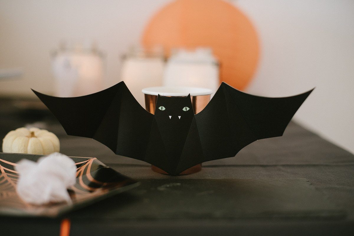 Für die Halloween-Party dekorieren wir unseren Tisch. Rosa Pappteller, Papierservietten in Fledermaus-Form, Milchflaschen und Pappbechern für die Getränke. Eine Girlande darf auch nicht fehlen!