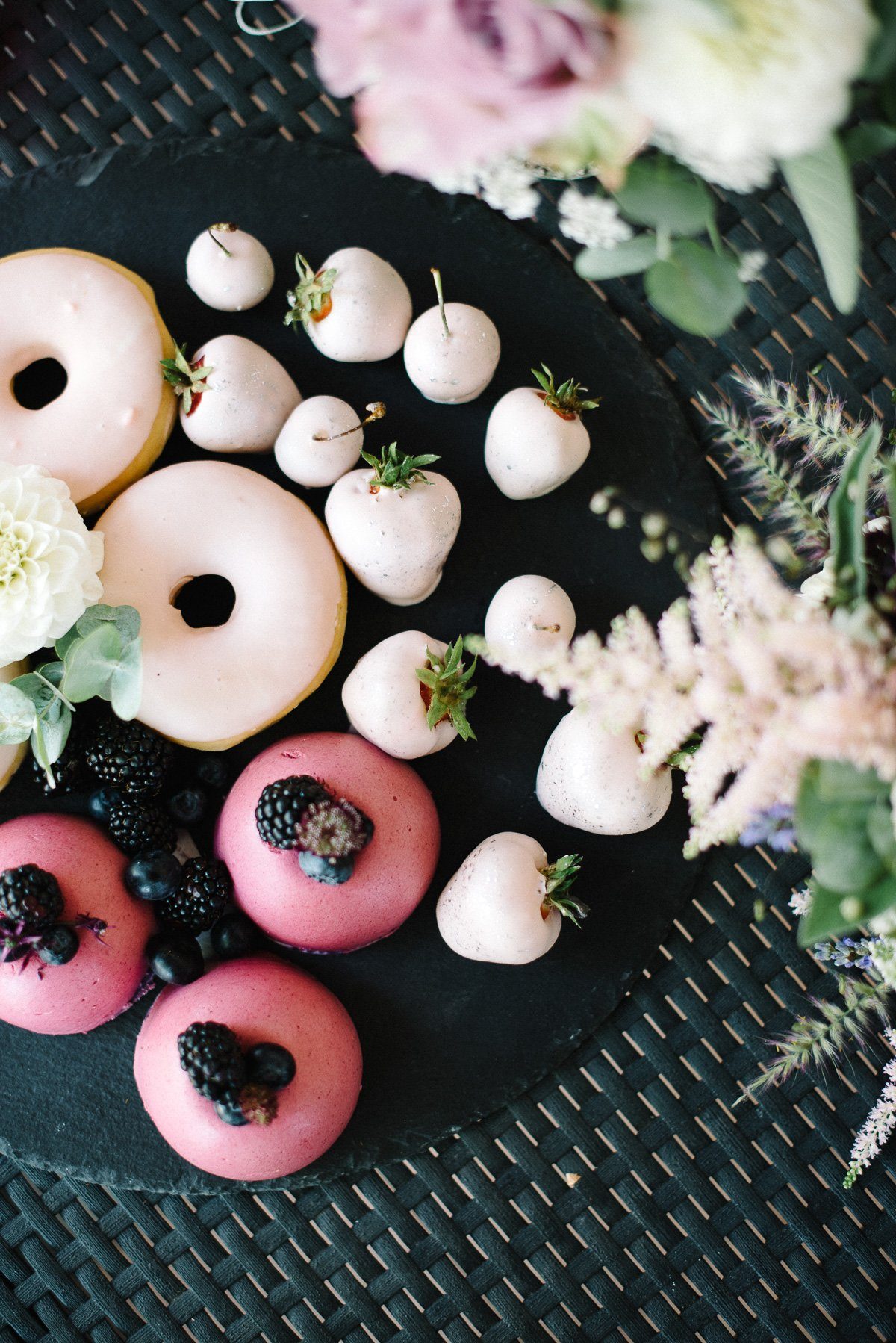 Dazu gibt es Mango Trüffel Pralinen im Gastgeschenk, Windbeutel gefüllt mit Crème Pâtissière, einen Pfälzer Rahmkuchen verziert mit frischen Blüten und Vanille Cupcakes mit Himbeertopping.