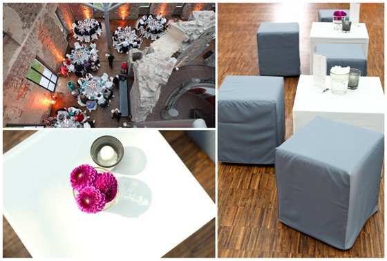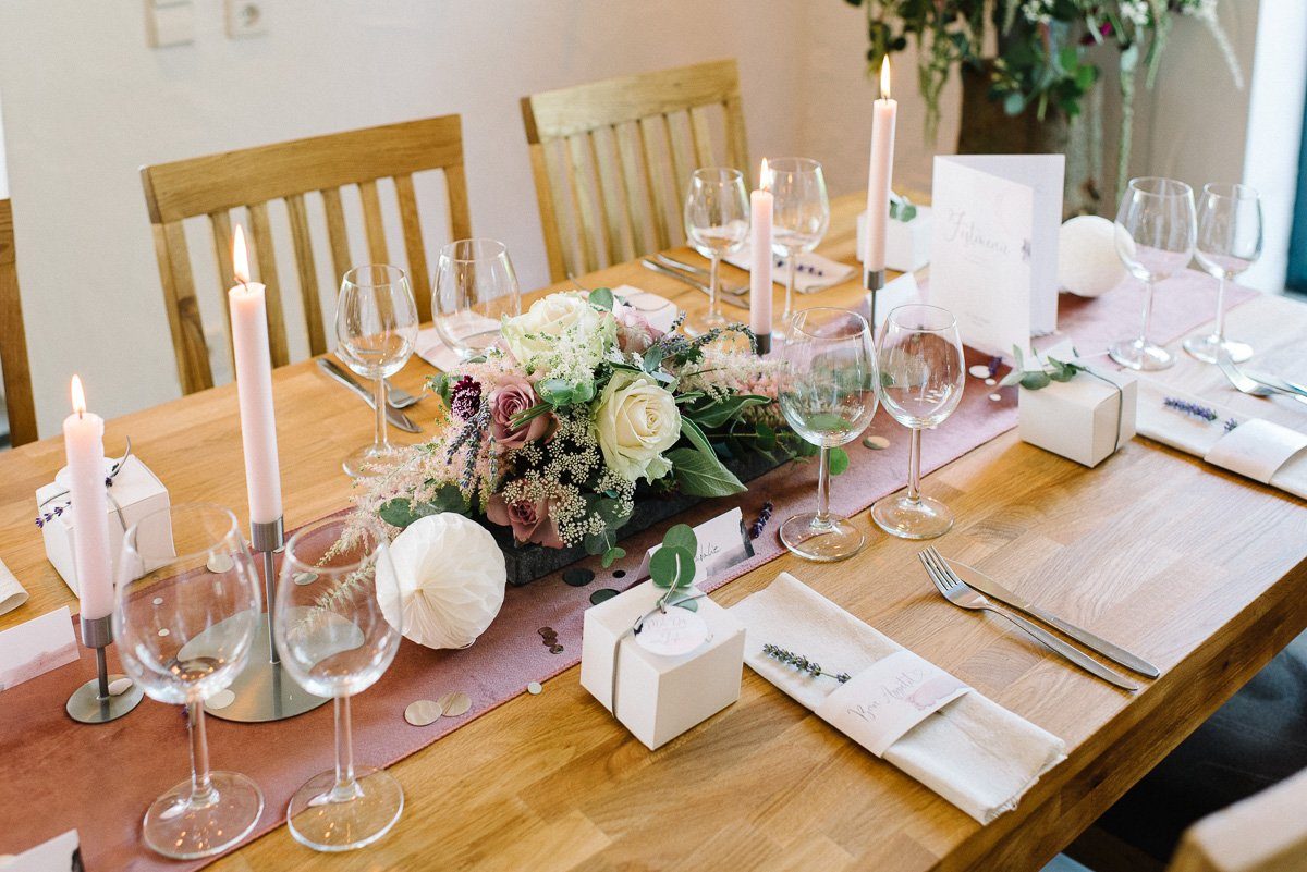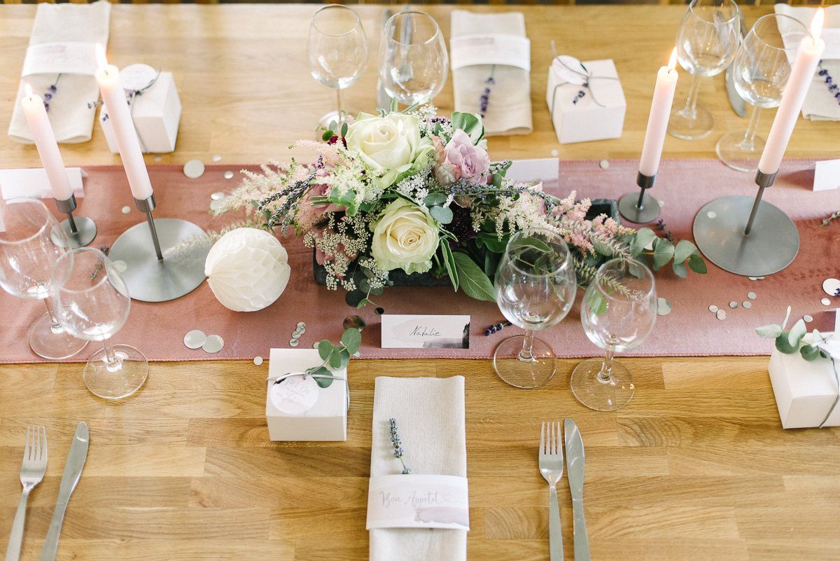 Viele Brautpaare stehen vor der Aufgabe weiße Tischdecken auf ihren Hochzeitstafeln mit Leben füllen zu müssen. Wenn dann die Location auch noch hell, clean und offen ist, fällt es schwer auf der “weißen” Fläche ein atemberaubendes, sommerliches Arragement zusammen zu stellen.
