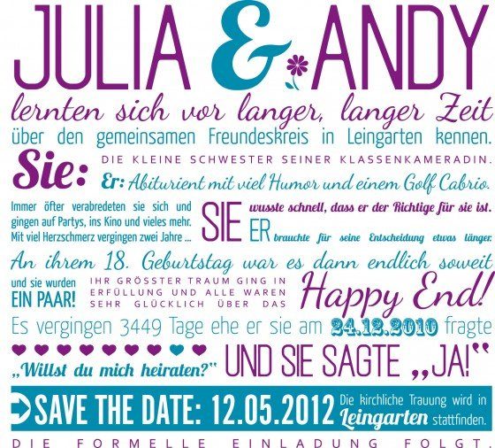 Besprecht mit eurem Grafiker wie ihr am Besten vorgeht. Legt Design, Typografie und Farben bereits fest. Lasst Hochzeitsdatum und die Namen eurer Gästen erstmal noch offen: