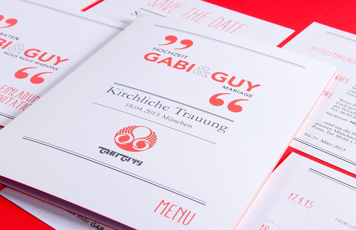 Besprecht mit eurem Grafiker wie ihr am Besten vorgeht. Legt Design, Typografie und Farben bereits fest. Lasst Hochzeitsdatum und die Namen eurer Gästen erstmal noch offen: