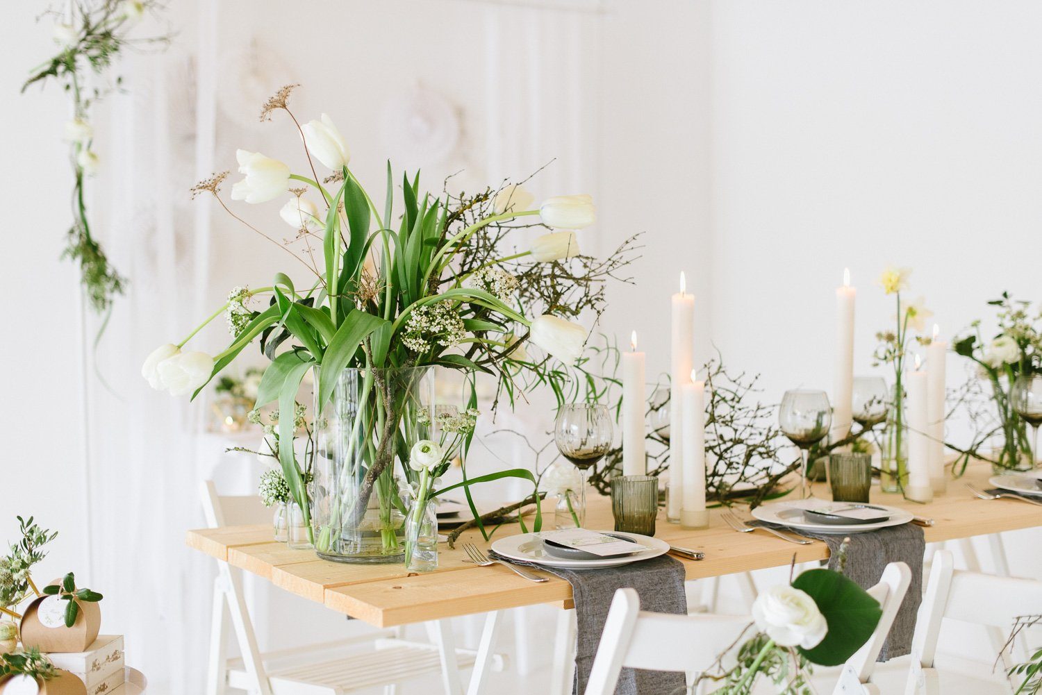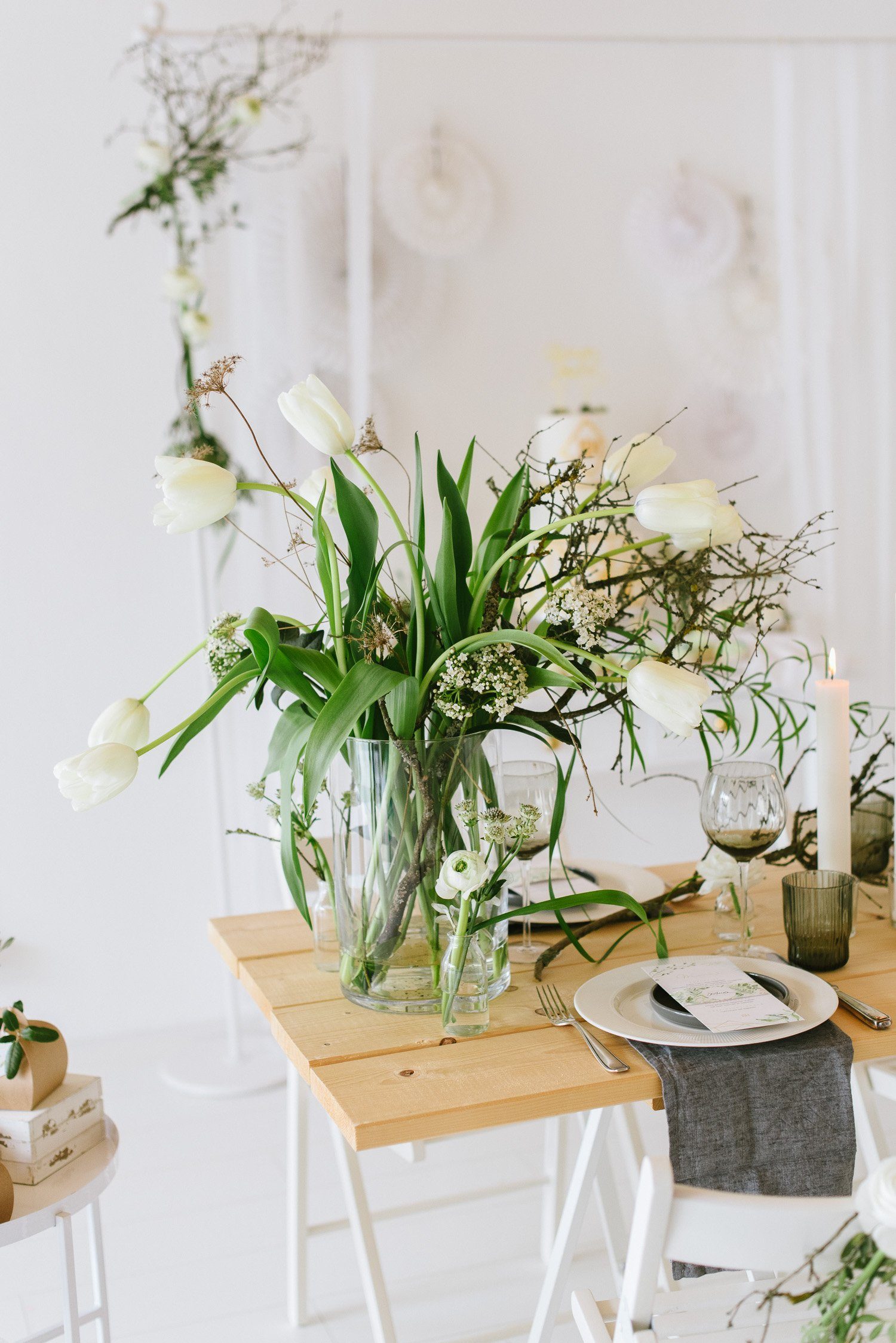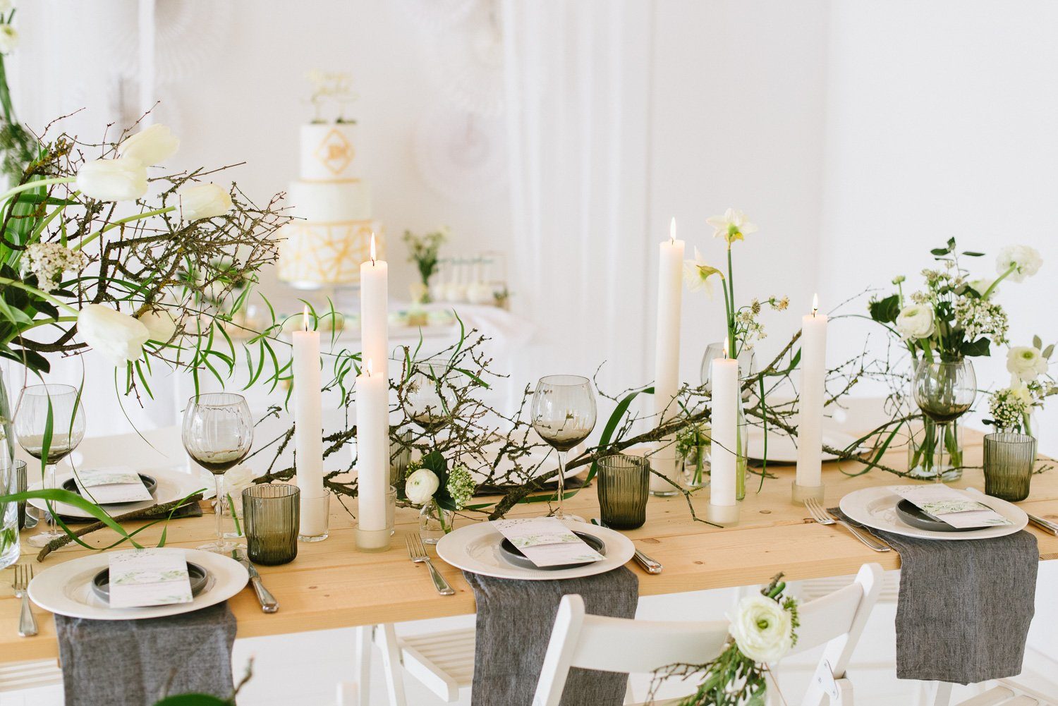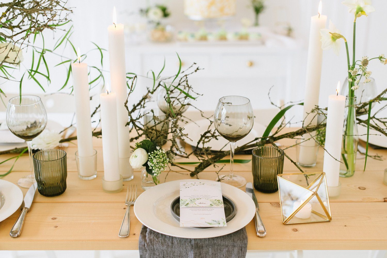 Keine übertriebenen Tablesettings sollten es sein. Sondern eine realistisch eingedeckte Festtafel, mit edlen Brottellern und einem floralen Centerpiece. Keine unnötigen Servietten, kein übertriebenes ChiChi. Umsetzbar und trotzdem sehr edel und festlich.