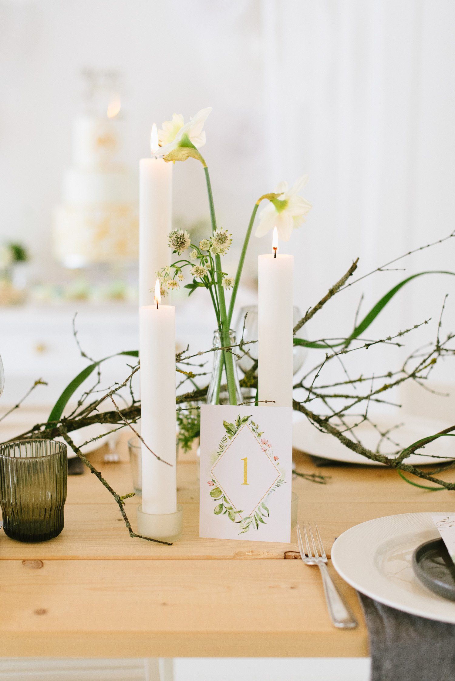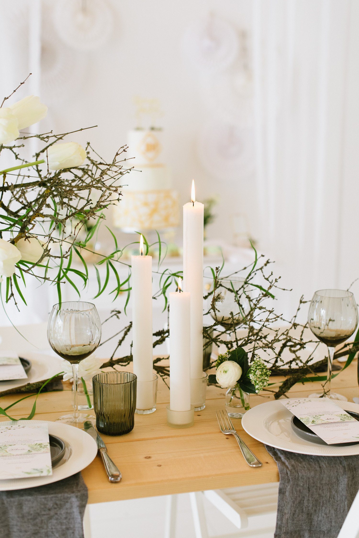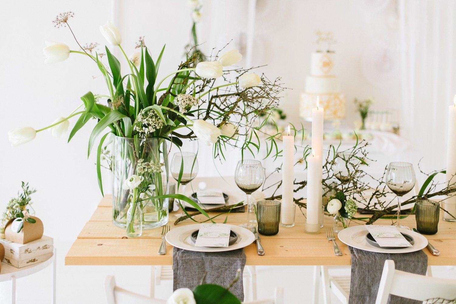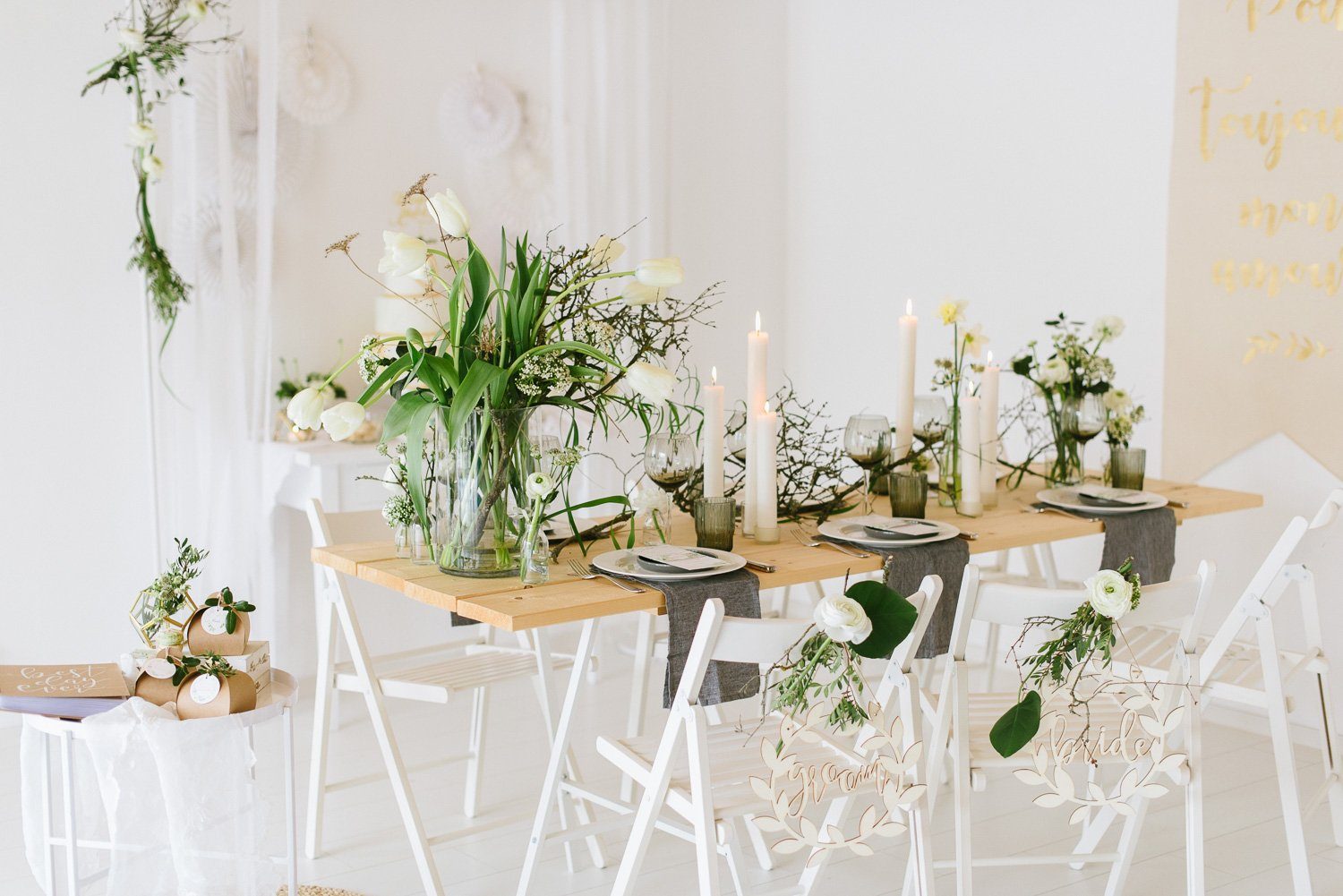 Keine übertriebenen Tablesettings sollten es sein. Sondern eine realistisch eingedeckte Festtafel, mit edlen Brottellern und einem floralen Centerpiece. Keine unnötigen Servietten, kein übertriebenes ChiChi. Umsetzbar und trotzdem sehr edel und festlich.