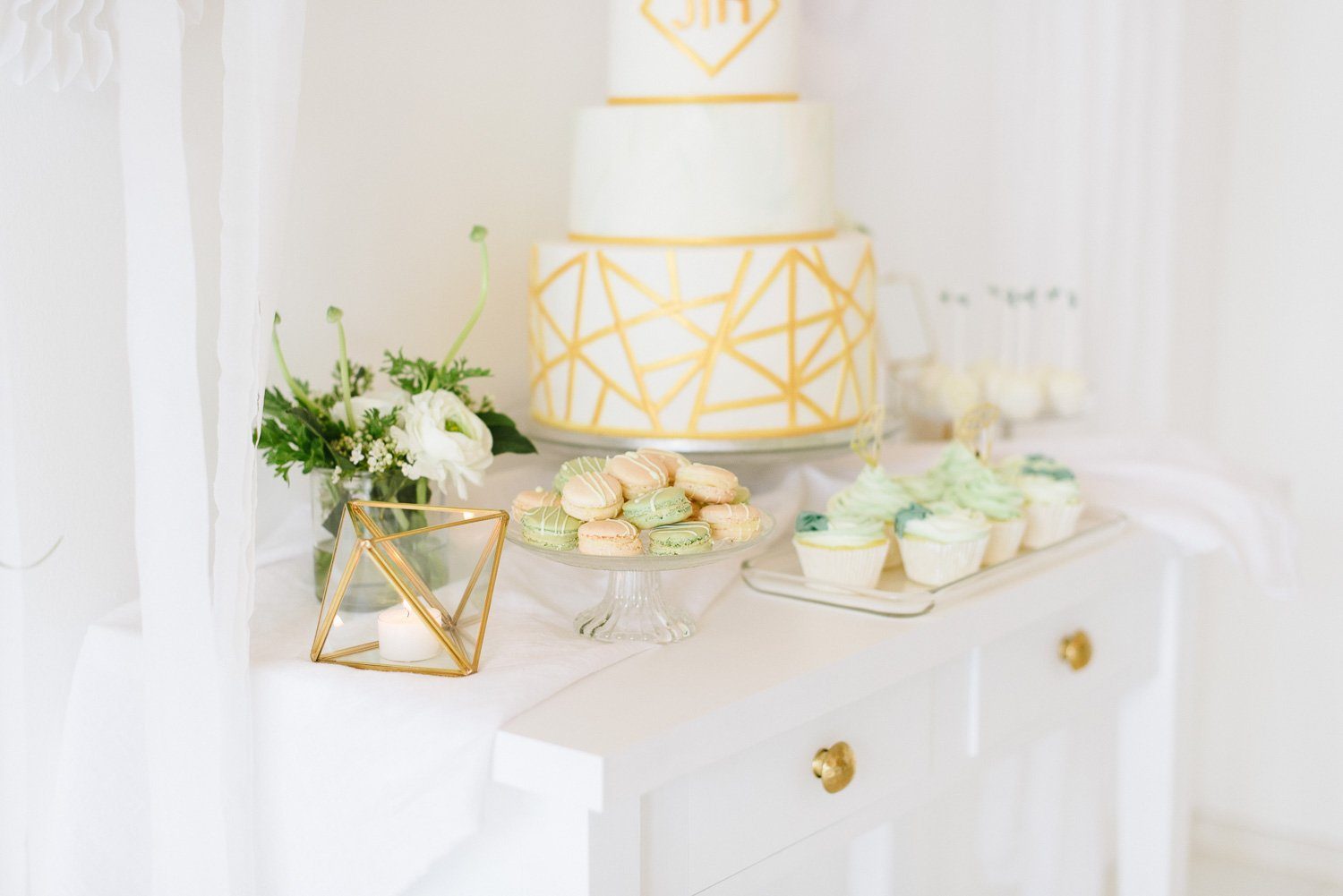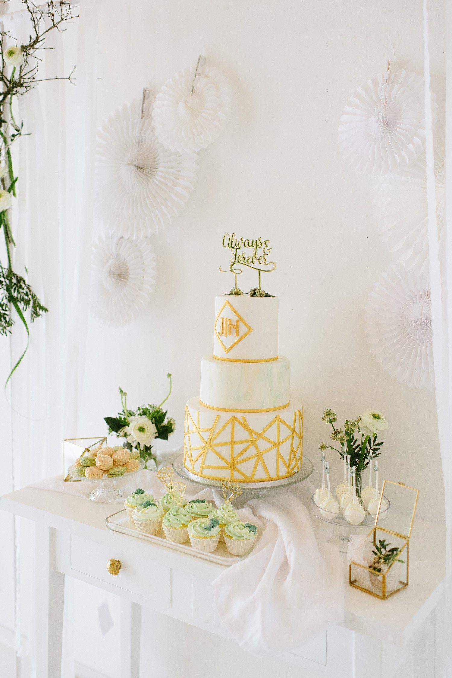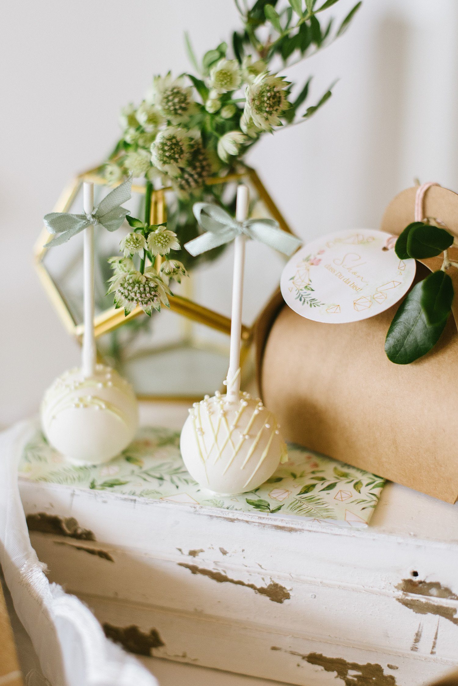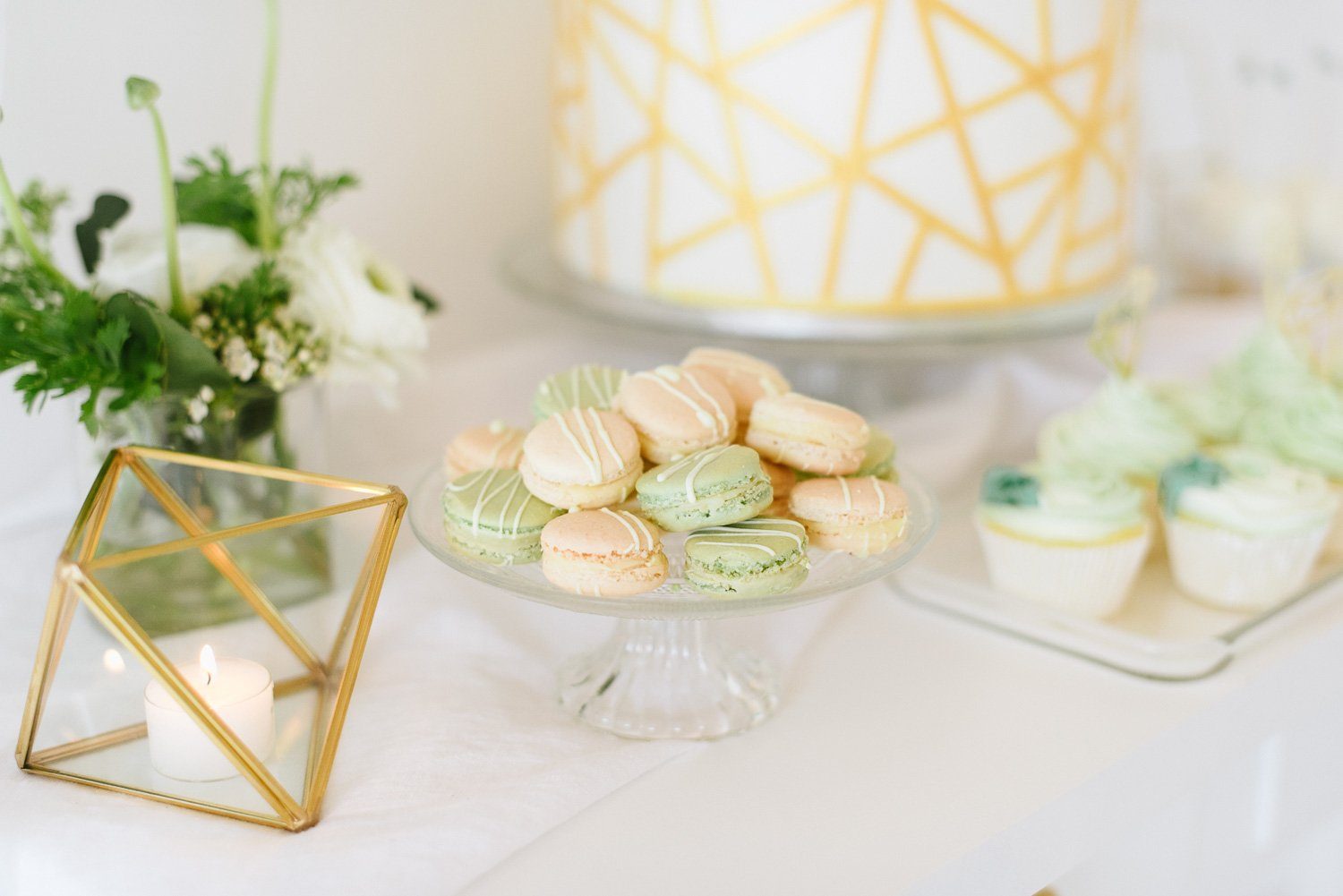 Side Cakes und einen Madeleines Tower umrahmen die Torte gekonnt. Für jeden Gast ist ein feines Törtchen eingedeckt, was das klassische Kuchenbuffet auflockert. Als Gastgeschenk finden die Gäste Macarons am Stiel an ihrem Platz.