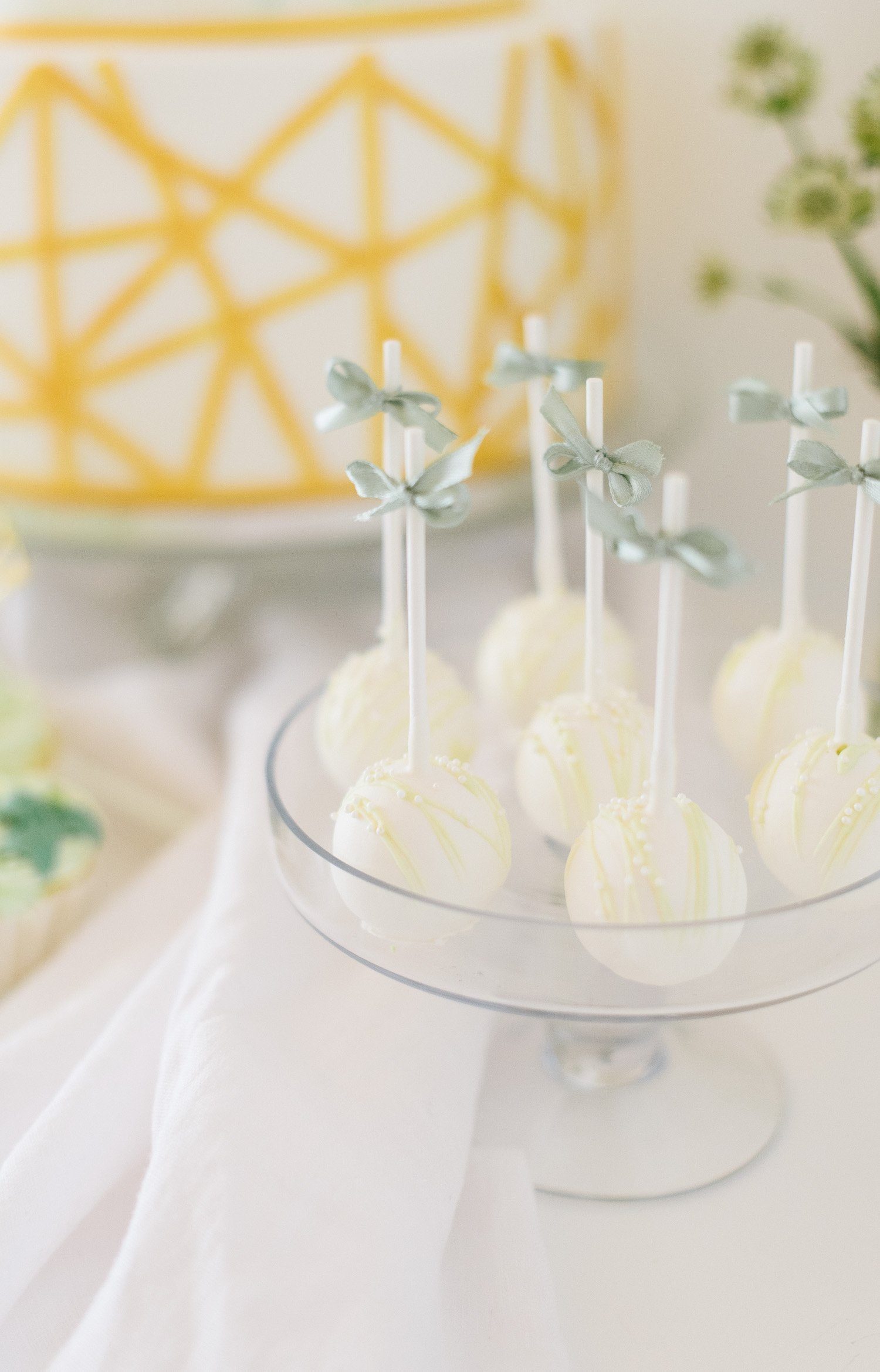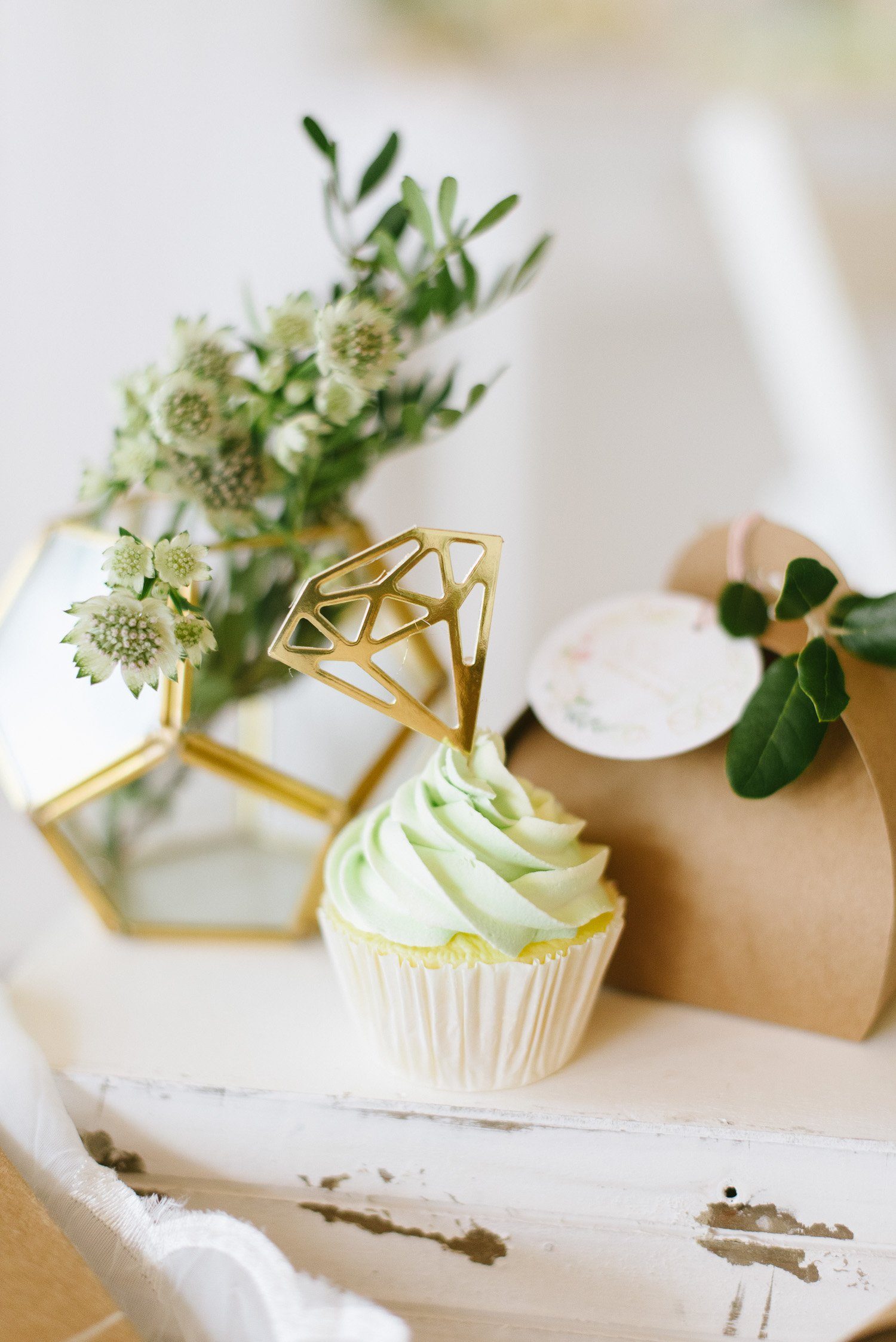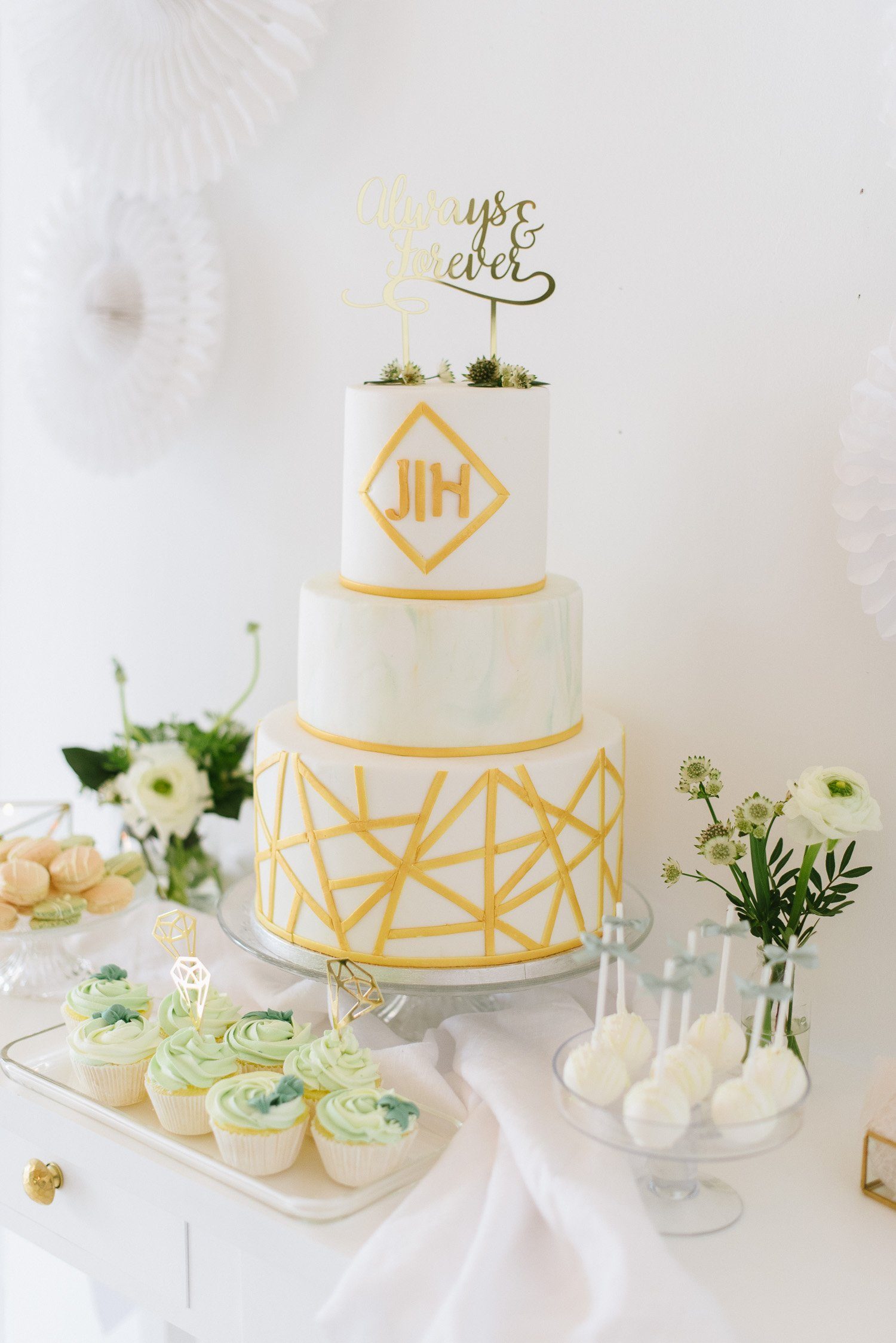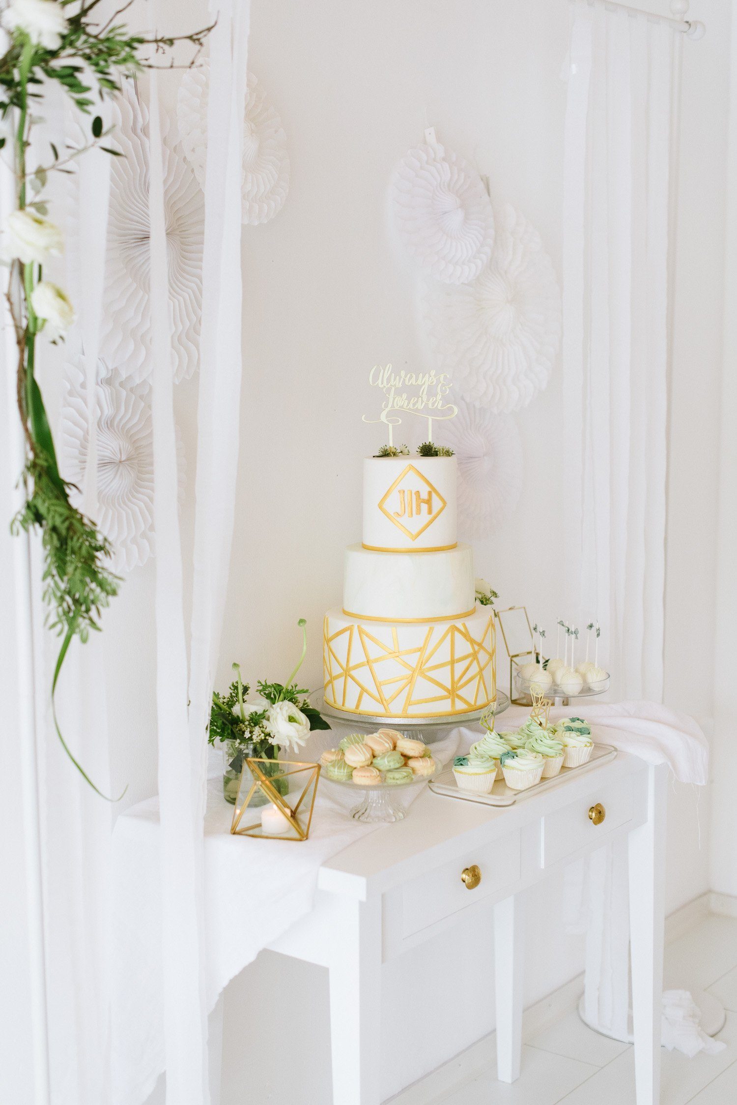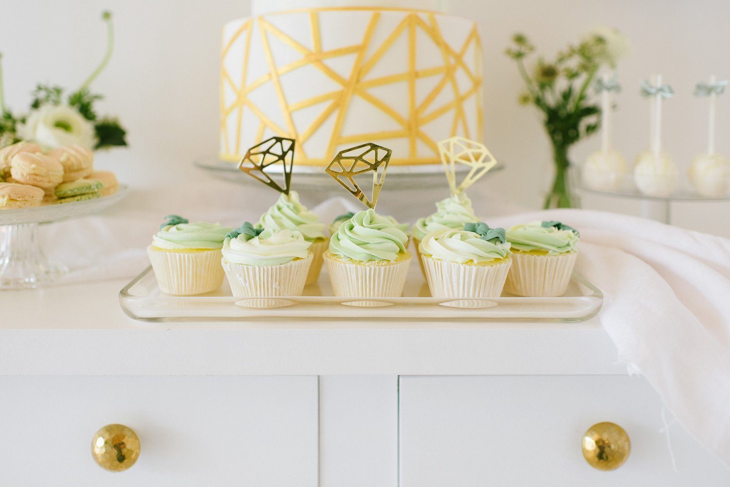 Side Cakes und einen Madeleines Tower umrahmen die Torte gekonnt. Für jeden Gast ist ein feines Törtchen eingedeckt, was das klassische Kuchenbuffet auflockert. Als Gastgeschenk finden die Gäste Macarons am Stiel an ihrem Platz.