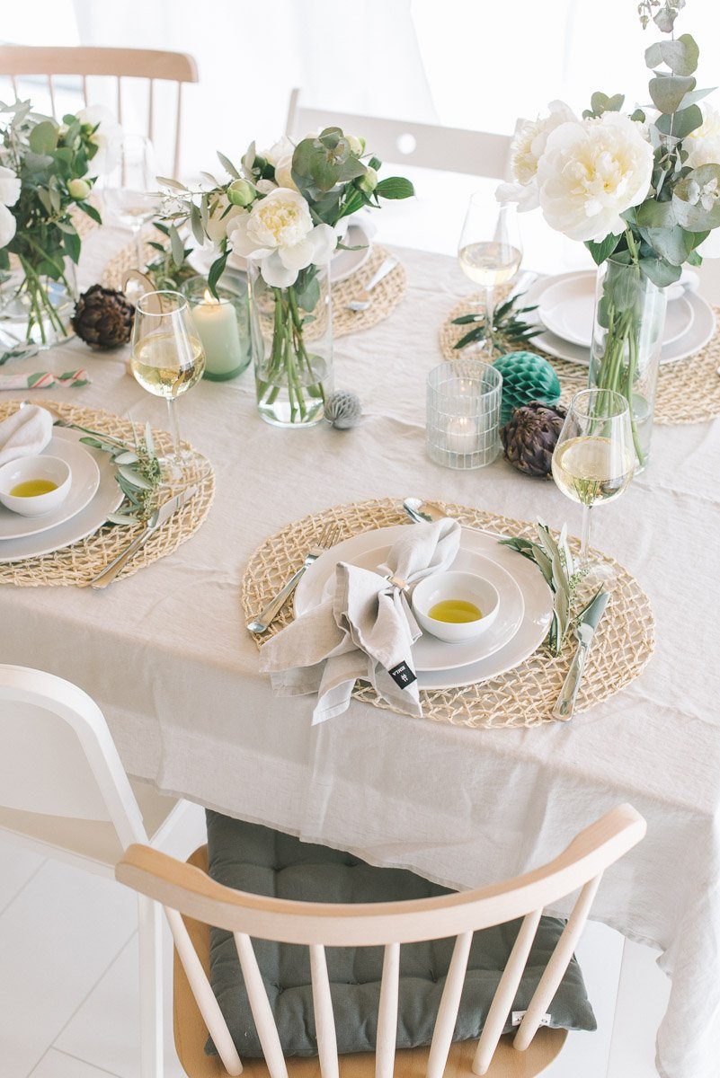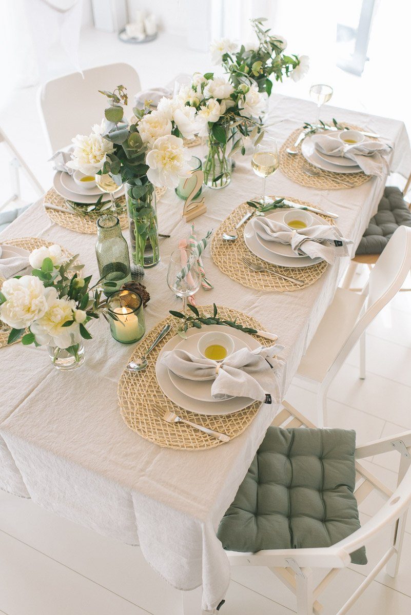 Lange Kerzenständer, in denen ebenfalls lange Stabkerzen stehen, bringen eine unheimliche Eleganz auf den Tisch! Während die naturfarbene Leinentischdecke für eine gewisse Entspanntheit steht, sorgen die Kerzenhalter in Gold sowie das goldene Besteck für einen schicken Kontrast.