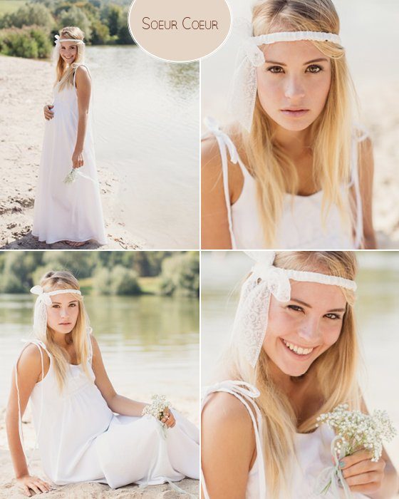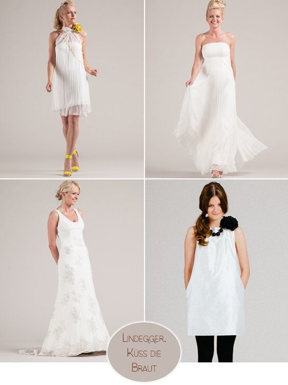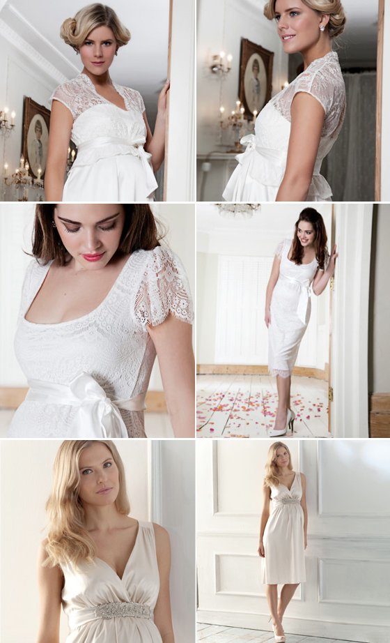 Viele schwangere Bräute heiraten in kurzen Kleidern, die die Taille oberhalb des Bauches betonen und den Babybauch locker umschmeicheln.