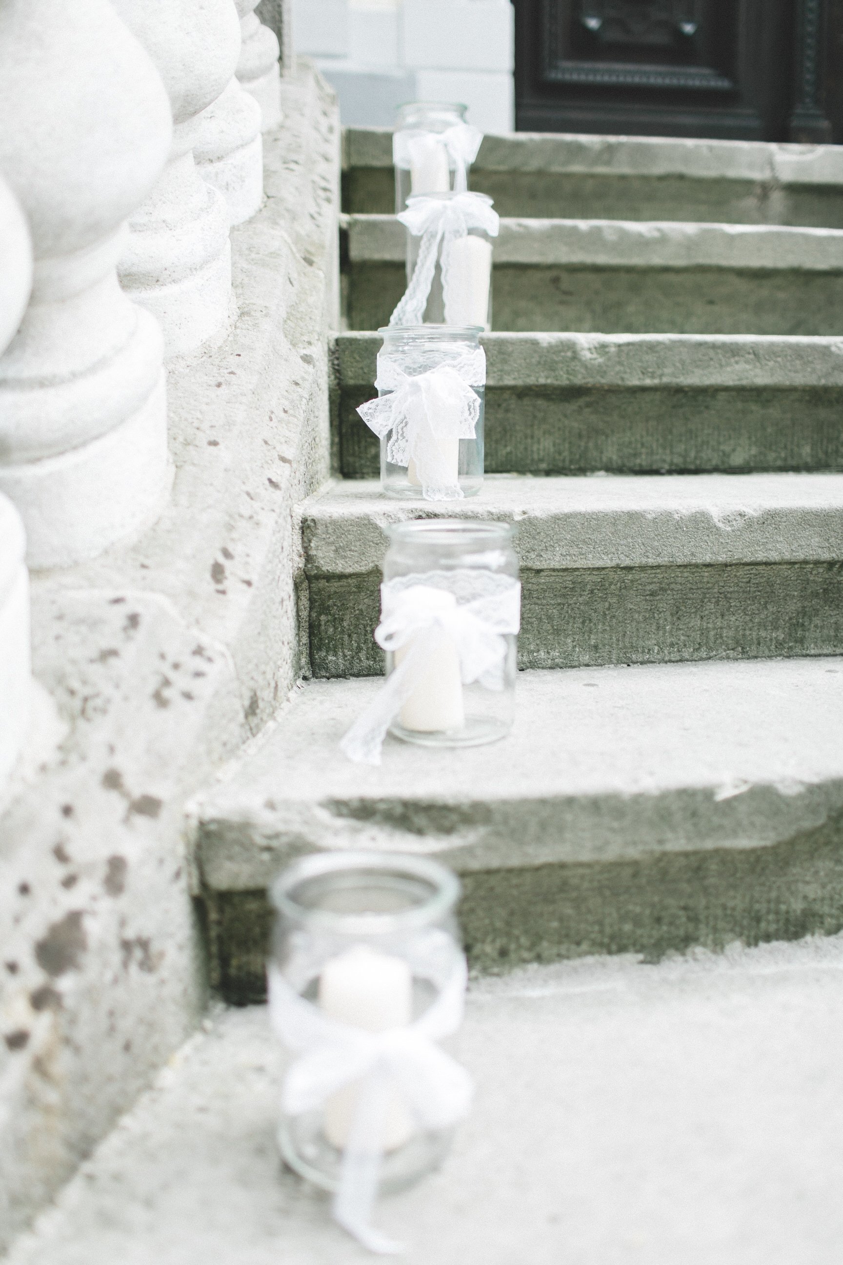 Bereits den Eingang zur Location hatten die beiden liebevoll mit Windlichtern dekoriert. Alte Einmachgläser bekamen hierfür ein Schleife aus Spitze verpasst.