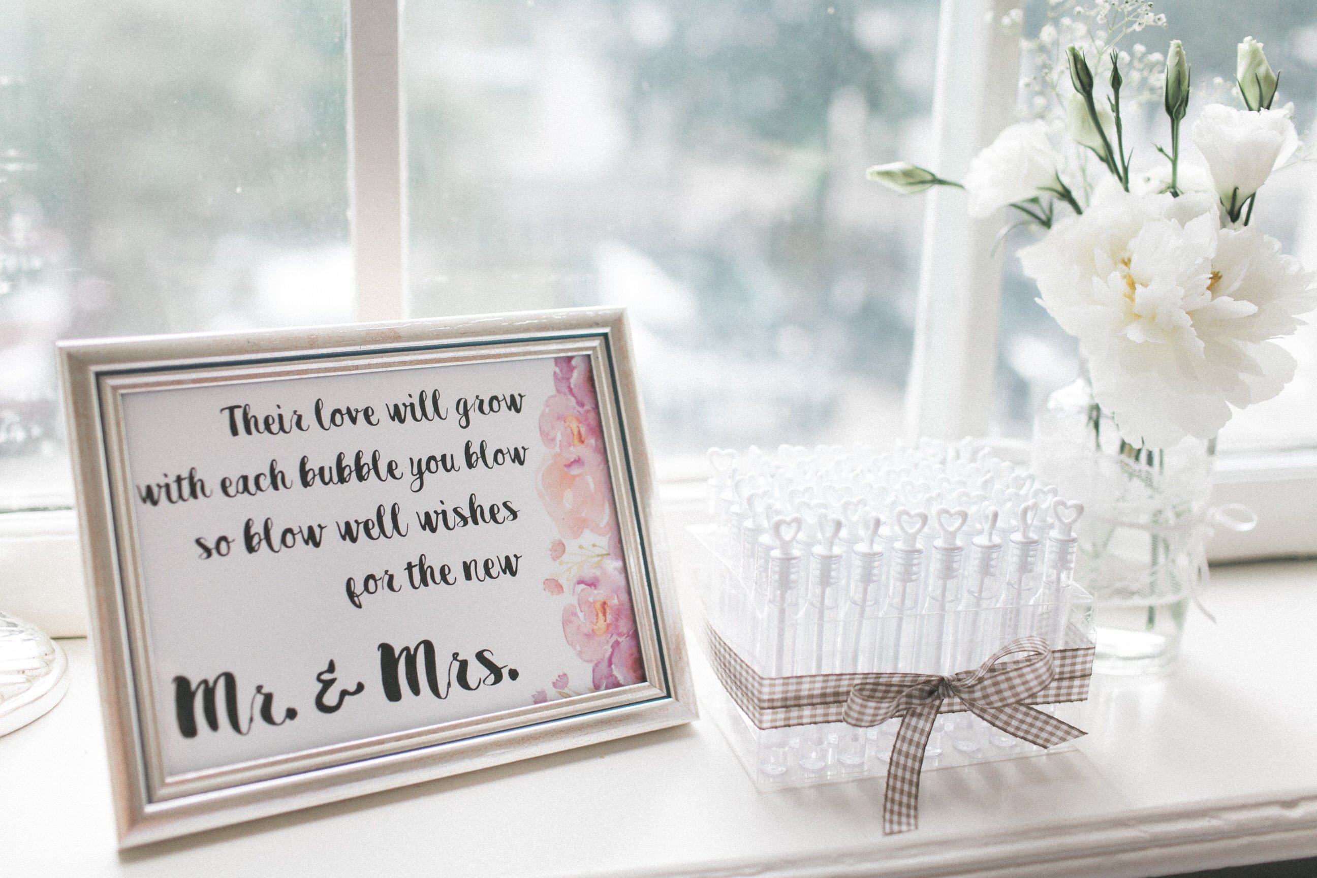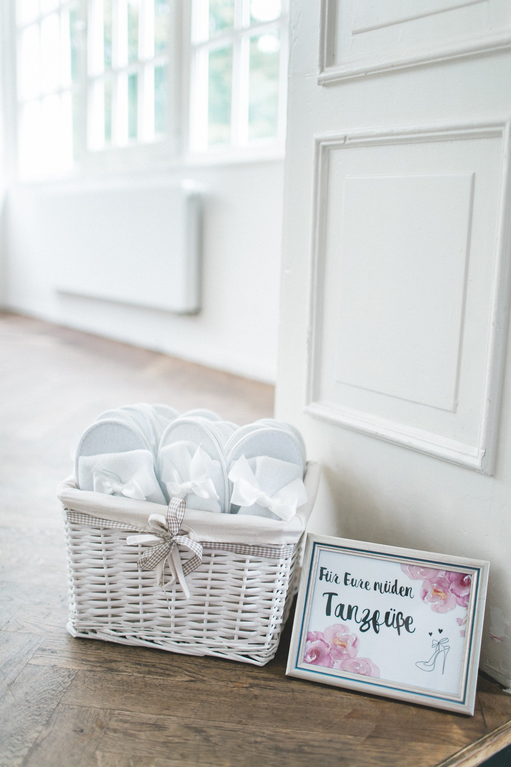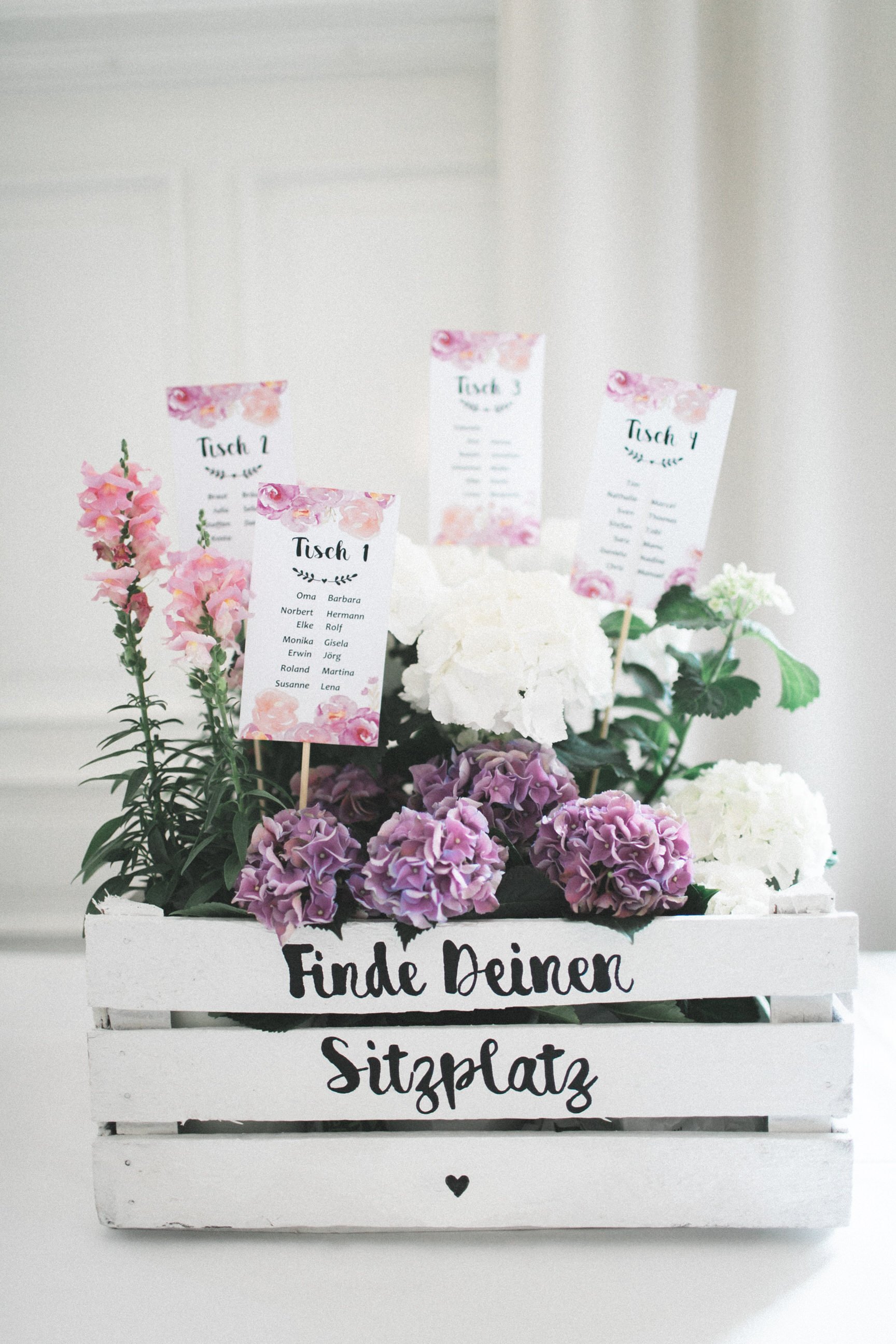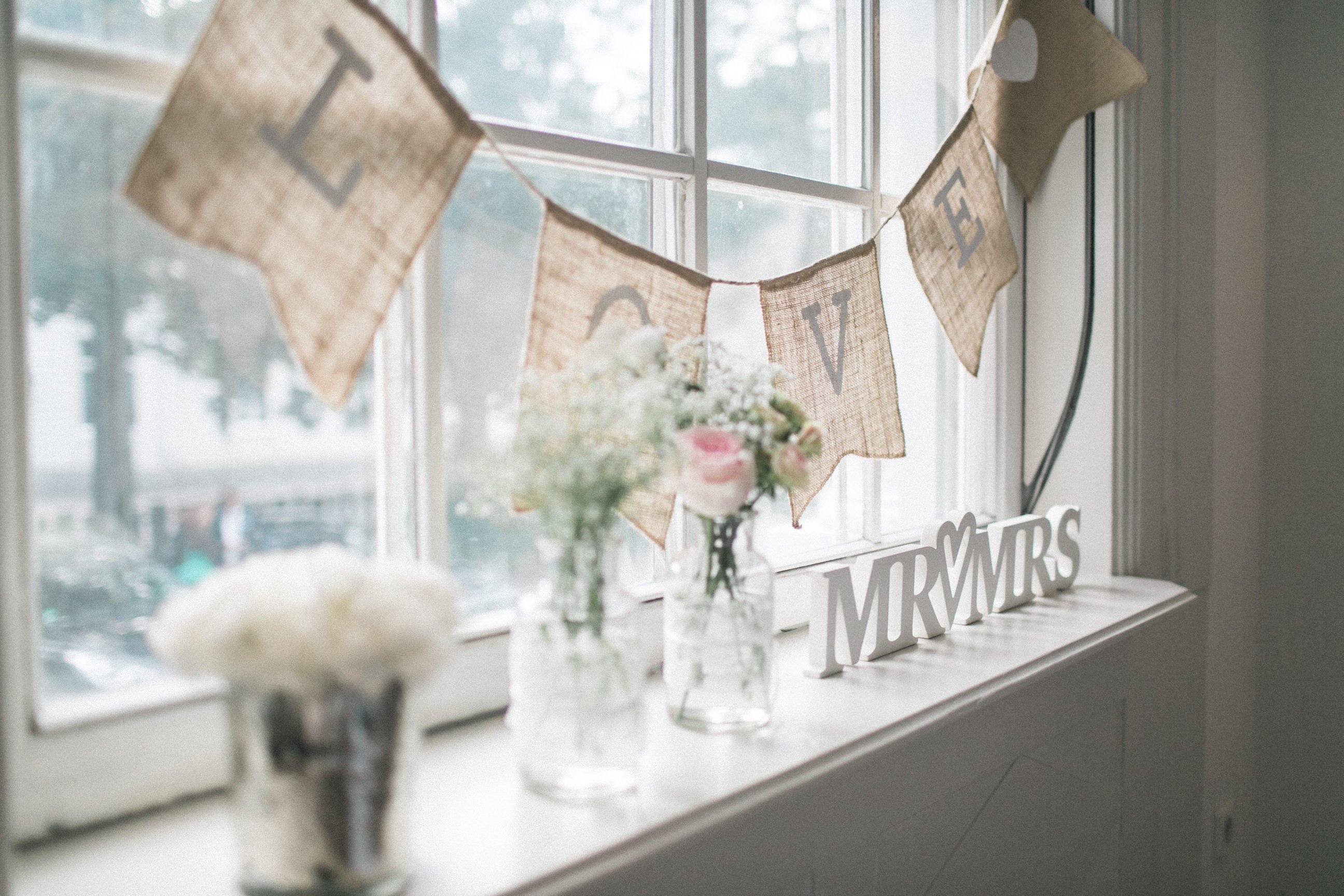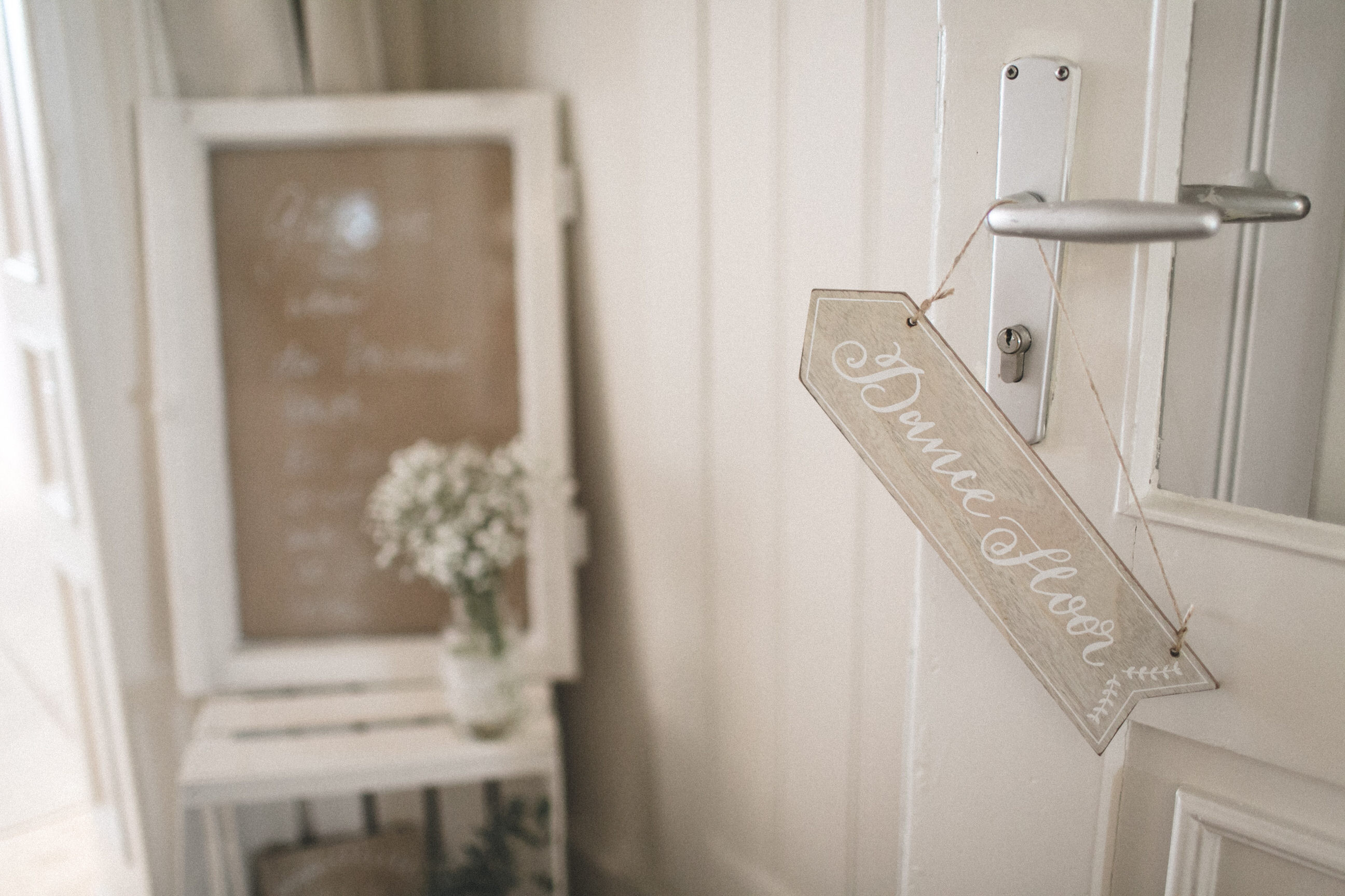 In der Location hatte Betty überall romantische Vintage Dekoaccessoires platziert. Ein Wegweiser hier, ein Schild dort, eine Wimpelkette aus Jute und dazu fluffig Blumen mit viel Schleierkraut.