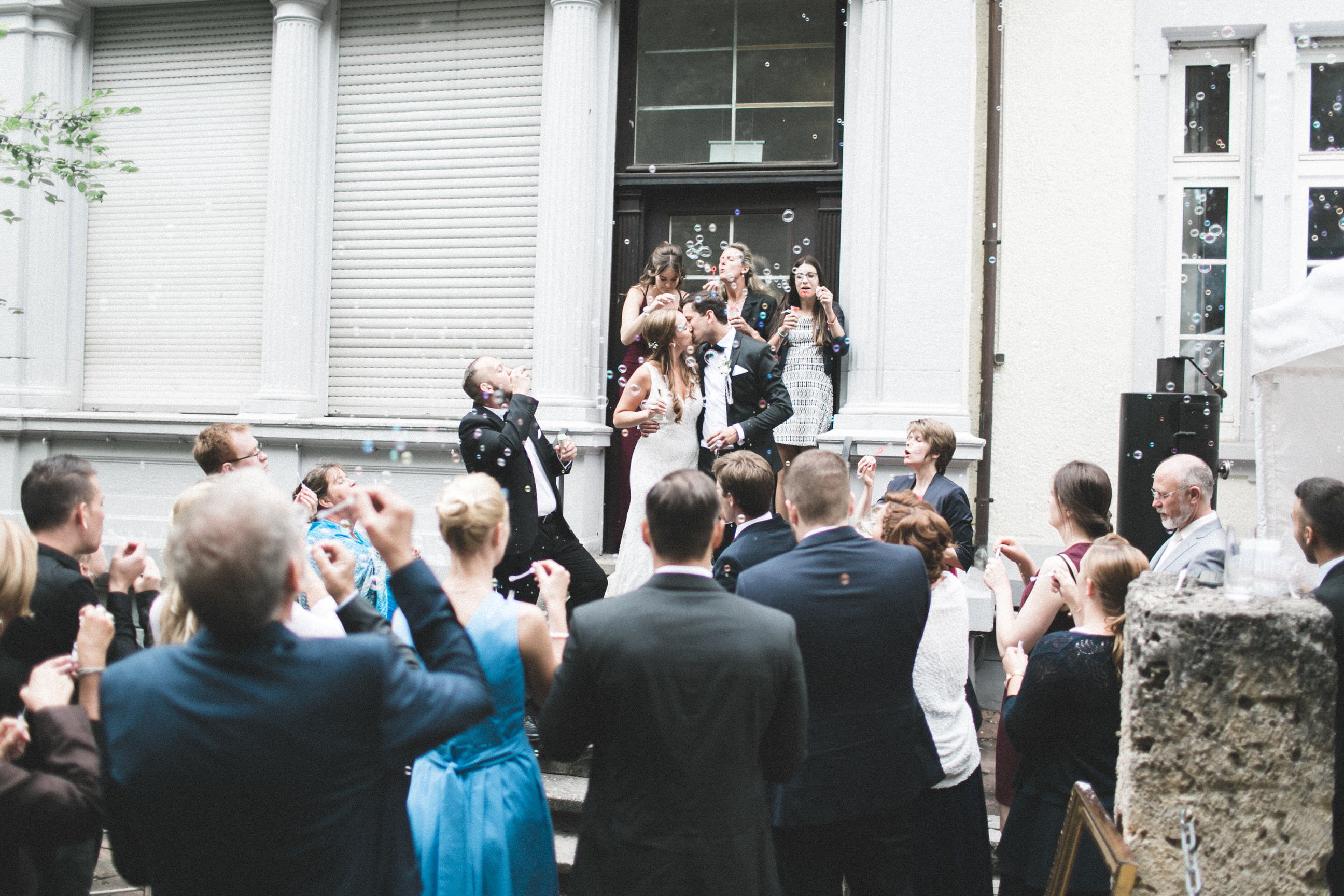 Nach einem ausgiebigen Portraitshooting war es dann endlich so weit: die freie Trauung im Schloss Kirchheim stand bevor. Dem gemeinsamen Einzug folgte eine emotionale Zeremonie, gekrönt durch das Ja der beiden. Mit einem Regen aus Seifenblasen wurden die beiden nach dem Auszug empfangen. Traumschön!