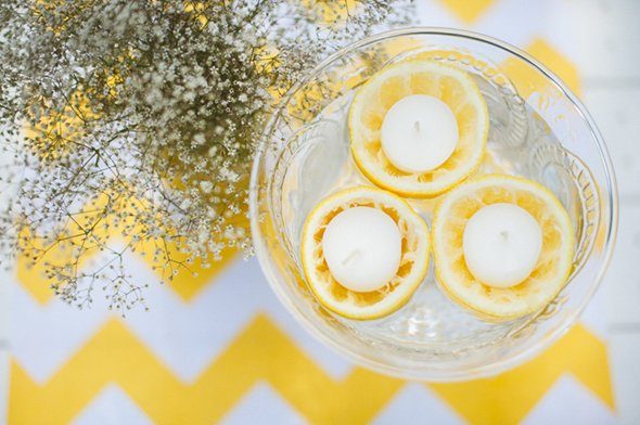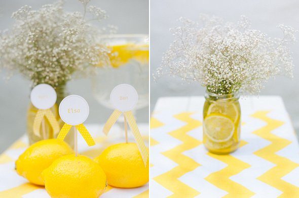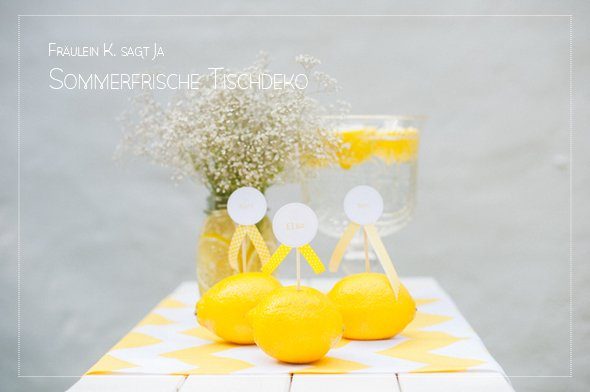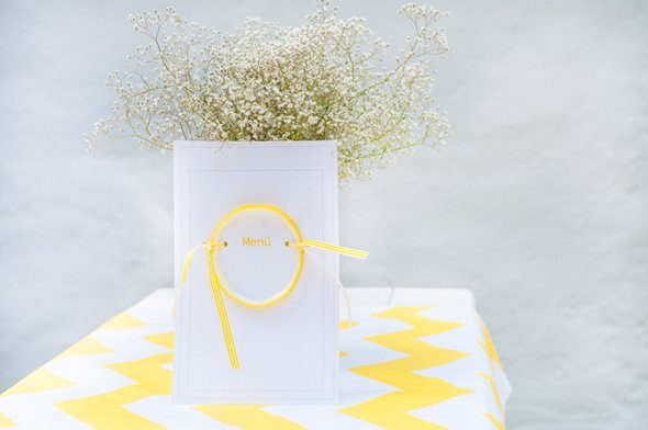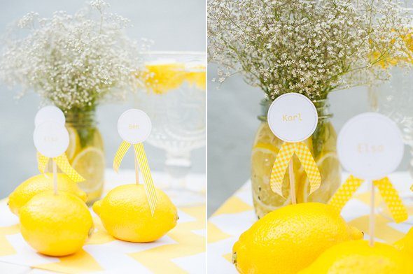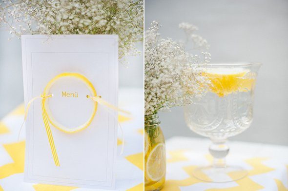 Der gelbe Farbton der Location war einer der Grundpfeiler des sommerlich mediterranen Hochzeitskonzeptes. Zitronen, Mangos und üppige Blüten wie Hortensien und Holunderblüten fanden sich nicht nur in der Papeterie wieder, sondern auch im Blumenschmuck in der Kirche und auf den Tischen des Festsaals. Mareike Förster, alias Anmut und Sinn, entwickelte die Dekoration und die Floristik. Ein fröhliches, stilvoll elegantes Farbenspiel, das sich wie ein gelber Faden durch den gesamten Tag zog.