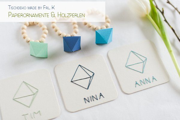 Frühlingshafte Tischdeko mit Papierornamenten und Holzperlen