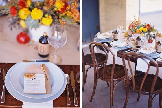 Natürliche Hochzeitstischdeko mit braunen Papiertüten und Packpapier