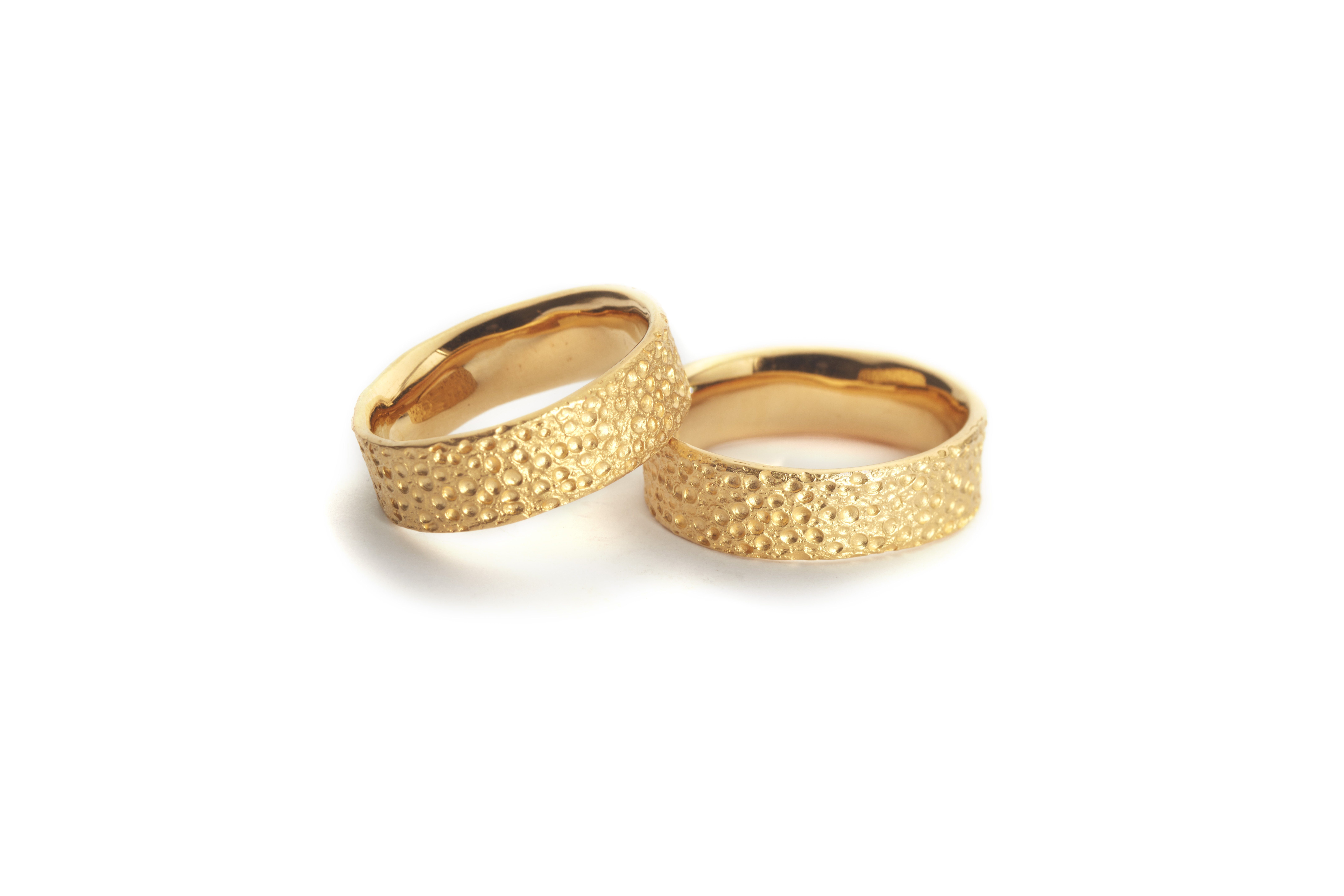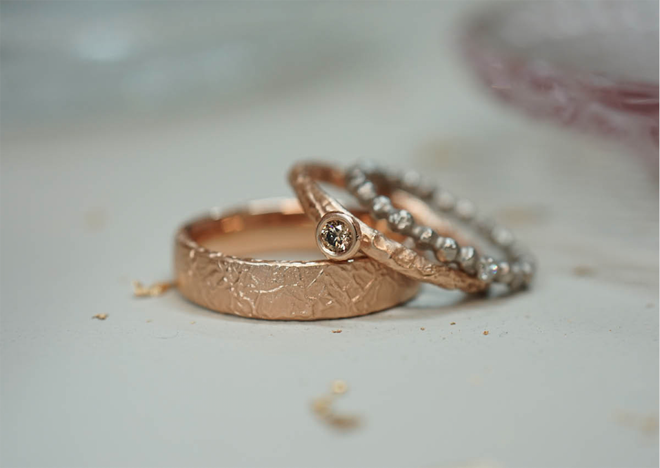 Auf die Frage, was für sie die Besonderheit an der Herstellung von Eheringen ist, antwortete Goldschmiedin Alexandra Baum aus Frankfurt: “Trauringe fertige ich besonders gerne an, da sie von allen Schmuckstücken am meisten zu einem Wegbegleiter werden, der die Trägerin und den Träger ein ganzes Leben begleitet. In den Oberflächenstrukturen und der Beschaffenheit der Ringe können viele Paare eine Verbindung zu ihrer eigenen Geschichte oder Beziehung sehen. Wenn meine Trauringkunden mit einem glücklichen Lächeln auf den Lippen mit ihren passenden Wegbegleitern nach Hause gehen ist es jedes Mal etwas ganz Besonderes für mich.”