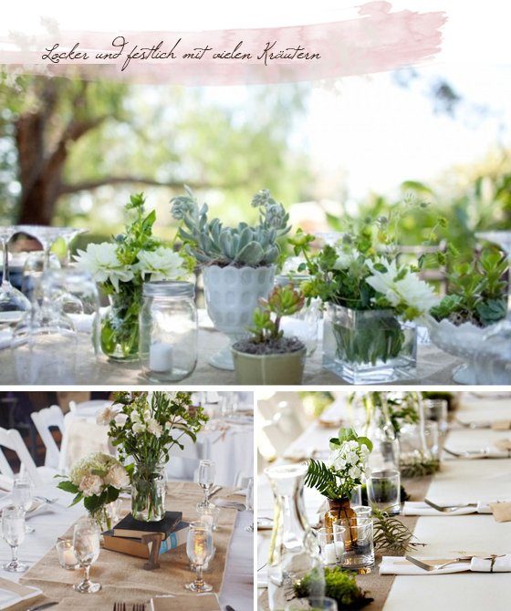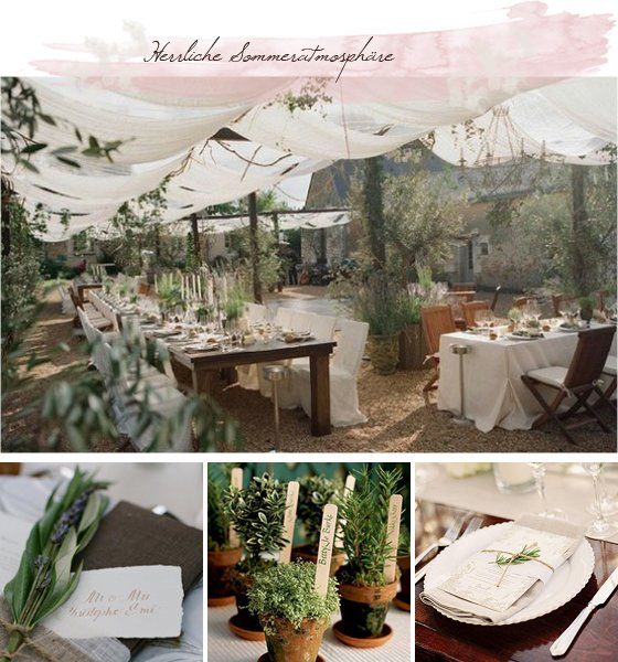 1) Was für eine perfekte Location, oder? Das wäre ein Traum dort! 2) Hier kommen die Kräuter und die Leinenstoffe wieder ins Spiel. Sehr hübsch, wenn man an jedem Platz solch ein Sträußchen hinterlegt 3) Ganz einfach auch selbst zu machen: Tontöpfe mit Kräutern in der Tischmitte oder auf den Stehtischen. Vielleicht auch mit diesen Namensschildchen… 4) Ein bisschen eleganter, aber auch sehr schön. Ein Tischplatz mit Menükarte und Kräuterzweig. Oder Lavendel?
