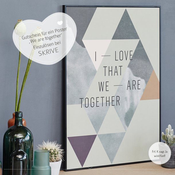 ‘I love that we are together’ lautet die Aufschrift des stylischen Posters von Skrive, das sich in einem Kupfer-, Messing oder Holzrahmen sicher hervorragend in Eurer Wohnung machen wird.