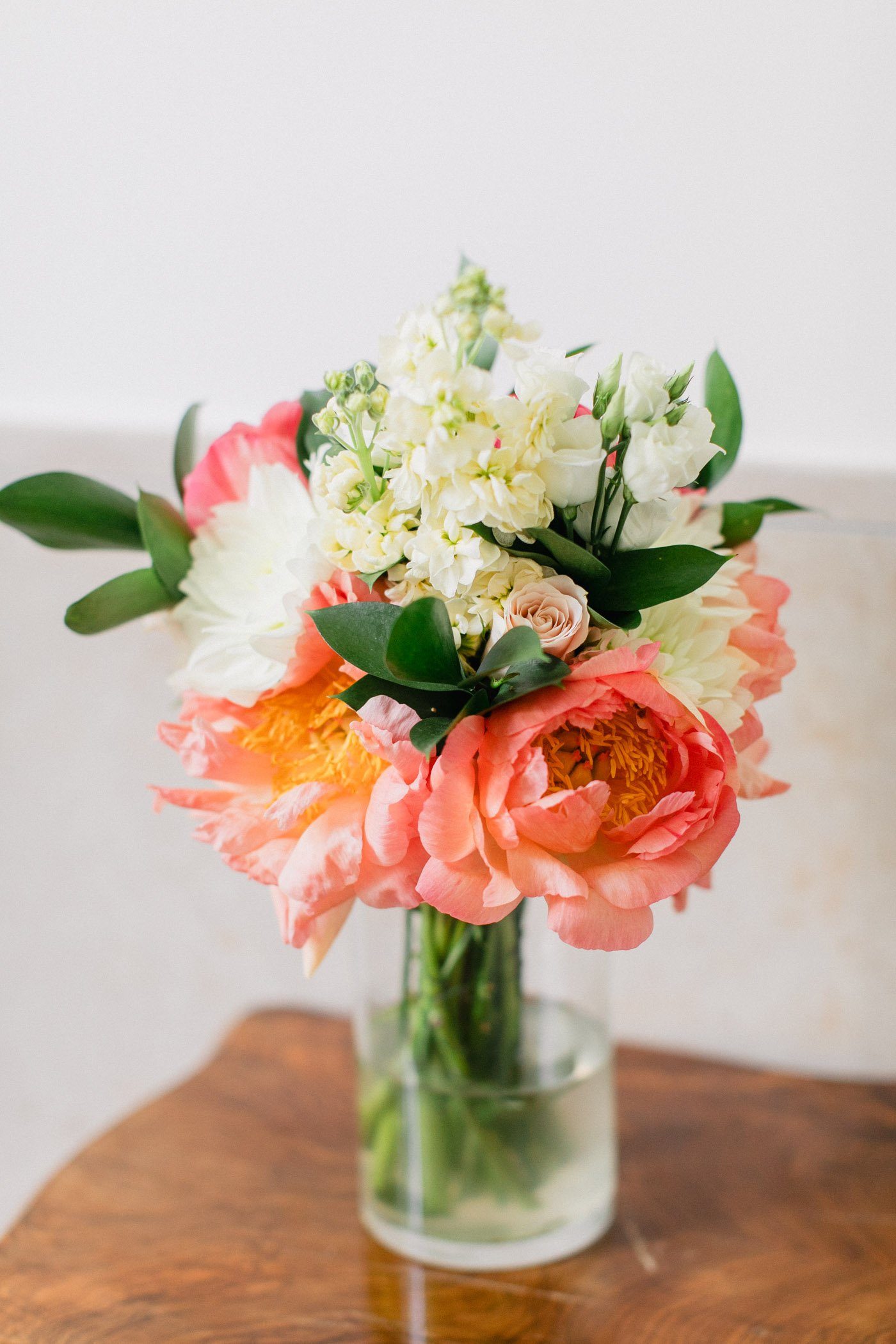 Und auch im sommerlichen Brautstrauß mit Pfingstrosen findet sich das Farbschema der Pink Grapefruit wieder.