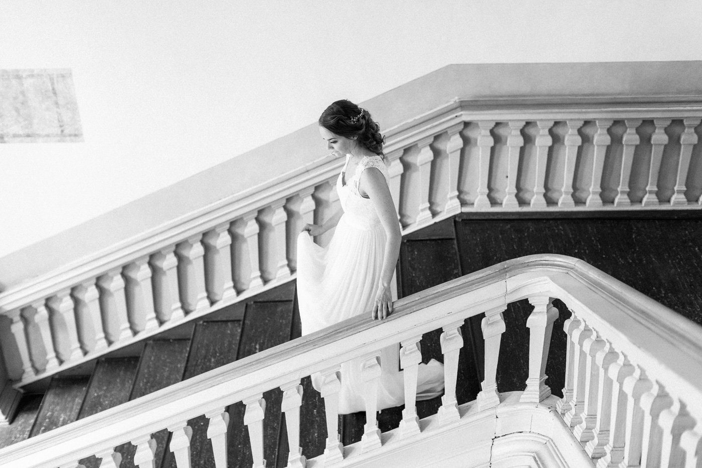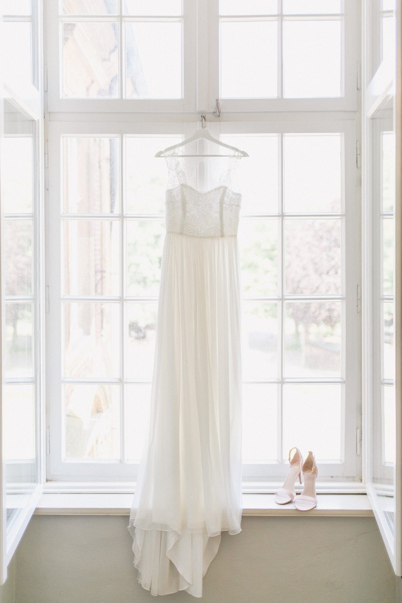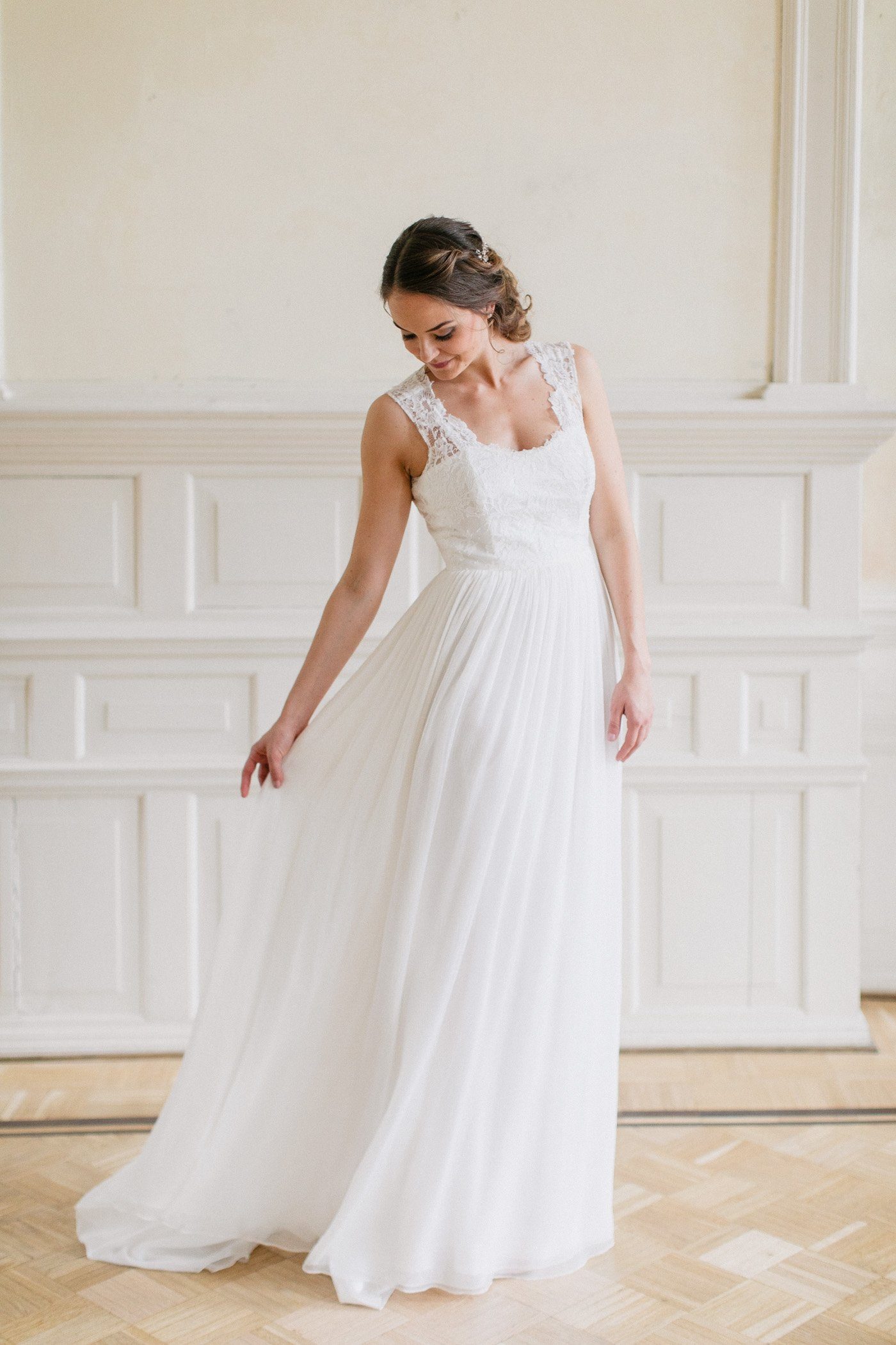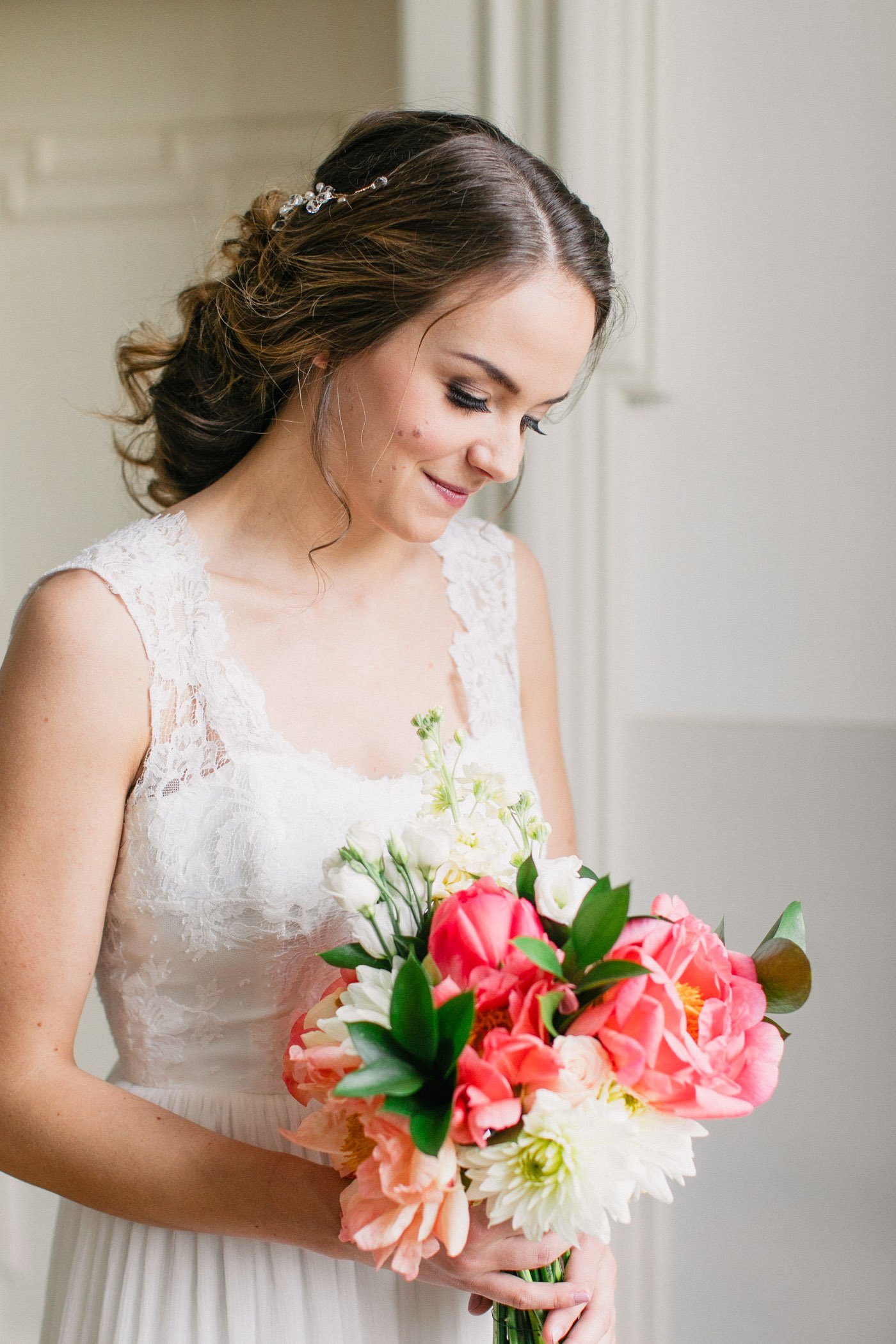 Das Brautstyling lag in den Händen von Stylingliebe Wiebke Hagenmeier. Ein wunderbar leichtes Brautklein in A-Linie mit fließendem Tüllrock und zarter Vintage-Spitze ergänzt das Pink Grapefruit Styled Shoot auf bezaubernde Weise. Das feine Haaraccessoire passt sich perfekt der brünetten Haarpracht der Braut an.