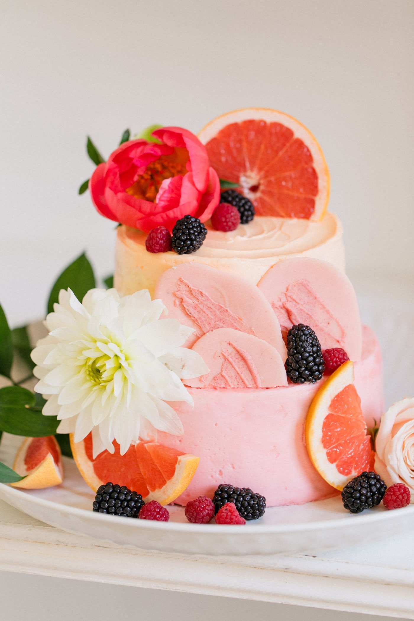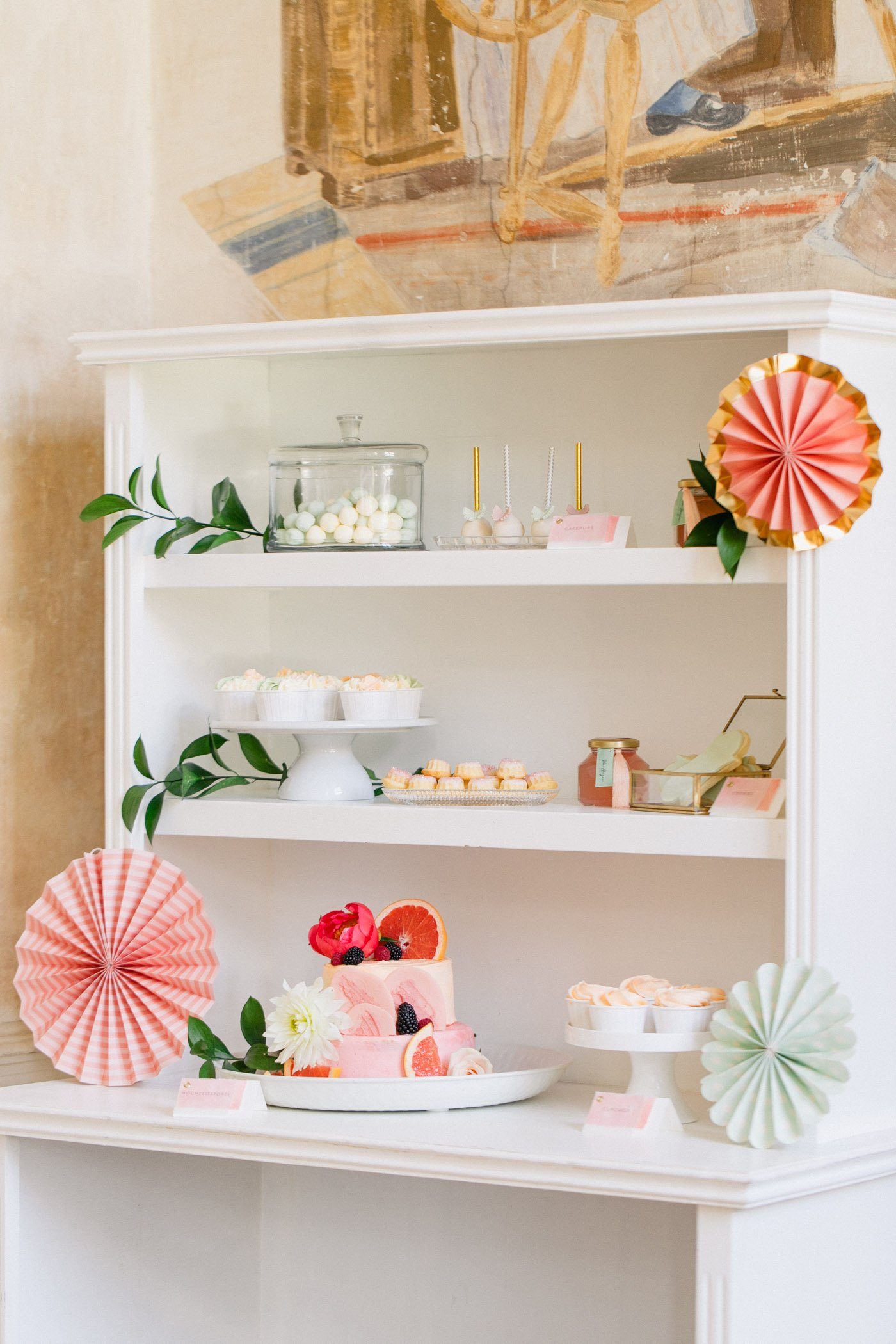 Im Wandschrank, der die Kulisse für die Candybar bietet sind kleine Törtchen, Cupcake und die Hochzeitstorte liebevoll angerichtet. Gemacht hat all diese Leckereien Cornelia Steinert von Zuckerkrönchen. Die Hochzeitstorte in verschiedenen rosa Farbtönen verzieren Beeren, Pfingstrosen und sogar frische Grapefruit-Schnitze.