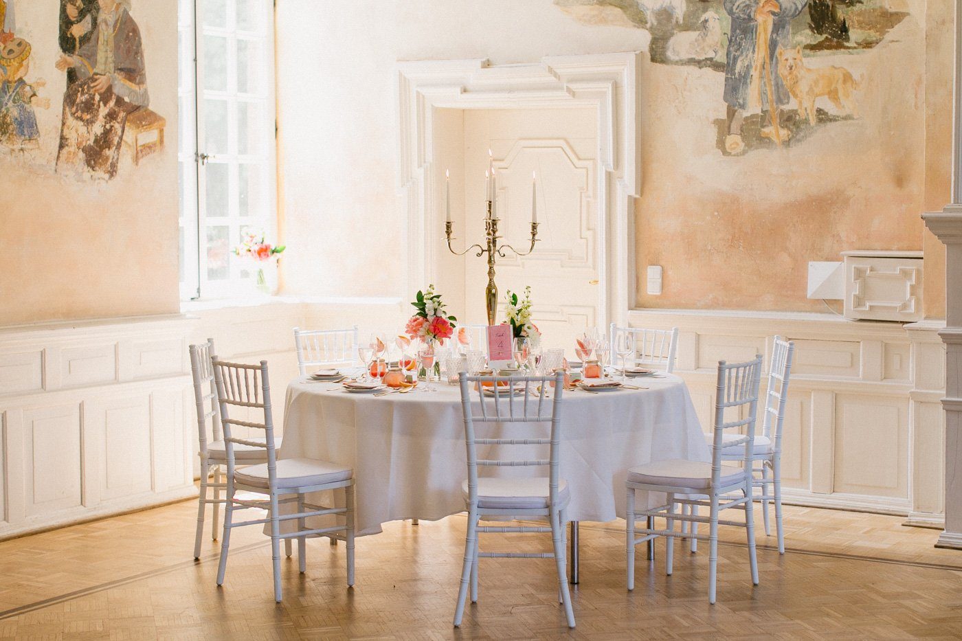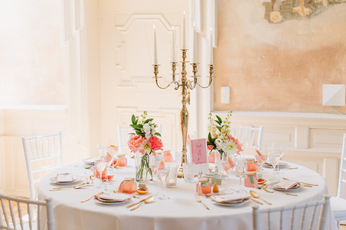 Vor den rustikalen alten Wänden mit Wandmalereien im Festsaal kommen die weißen Stühle und Tischdecken und besonders die Grapefruit-farbenen Dekorationen besonders gut zur Geltung. Auf den Tischen angerichtet ist das Geschirr aus elegantem weißem Porzellan mit feinem Goldrand und große goldene Kerzenhalter. Passend dazu das goldene Besteck auf den Tischen.