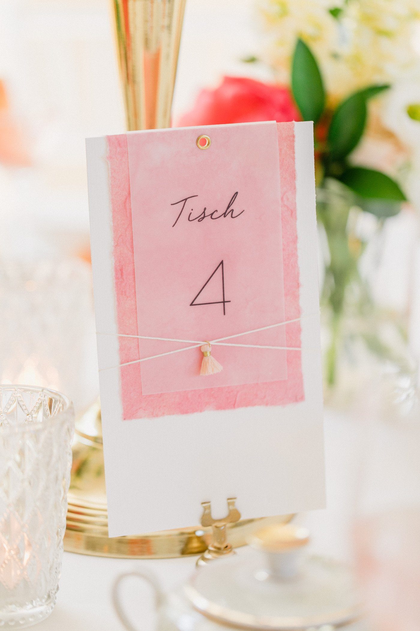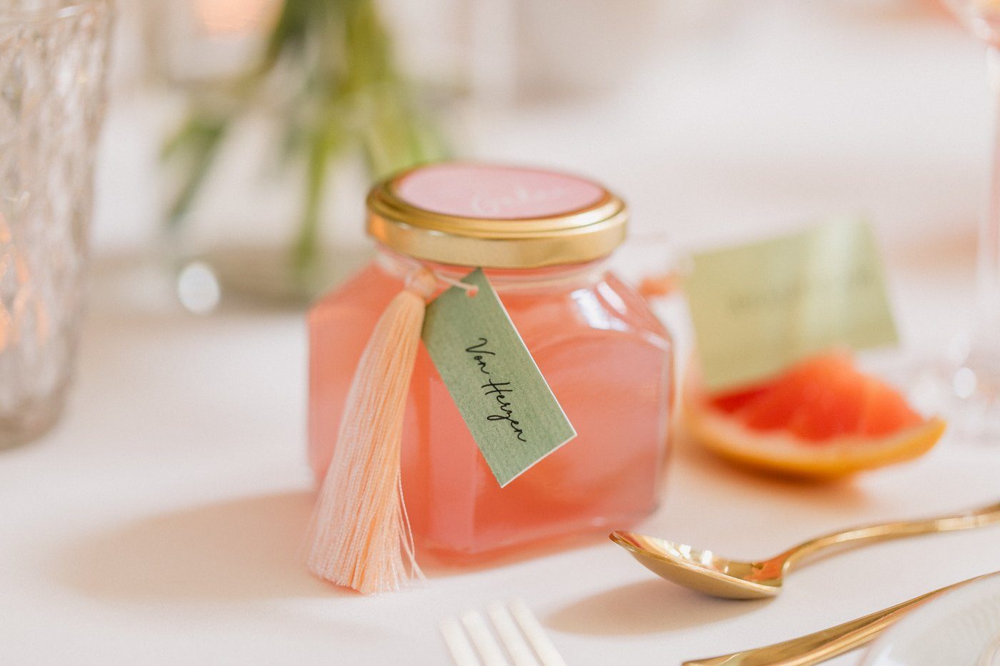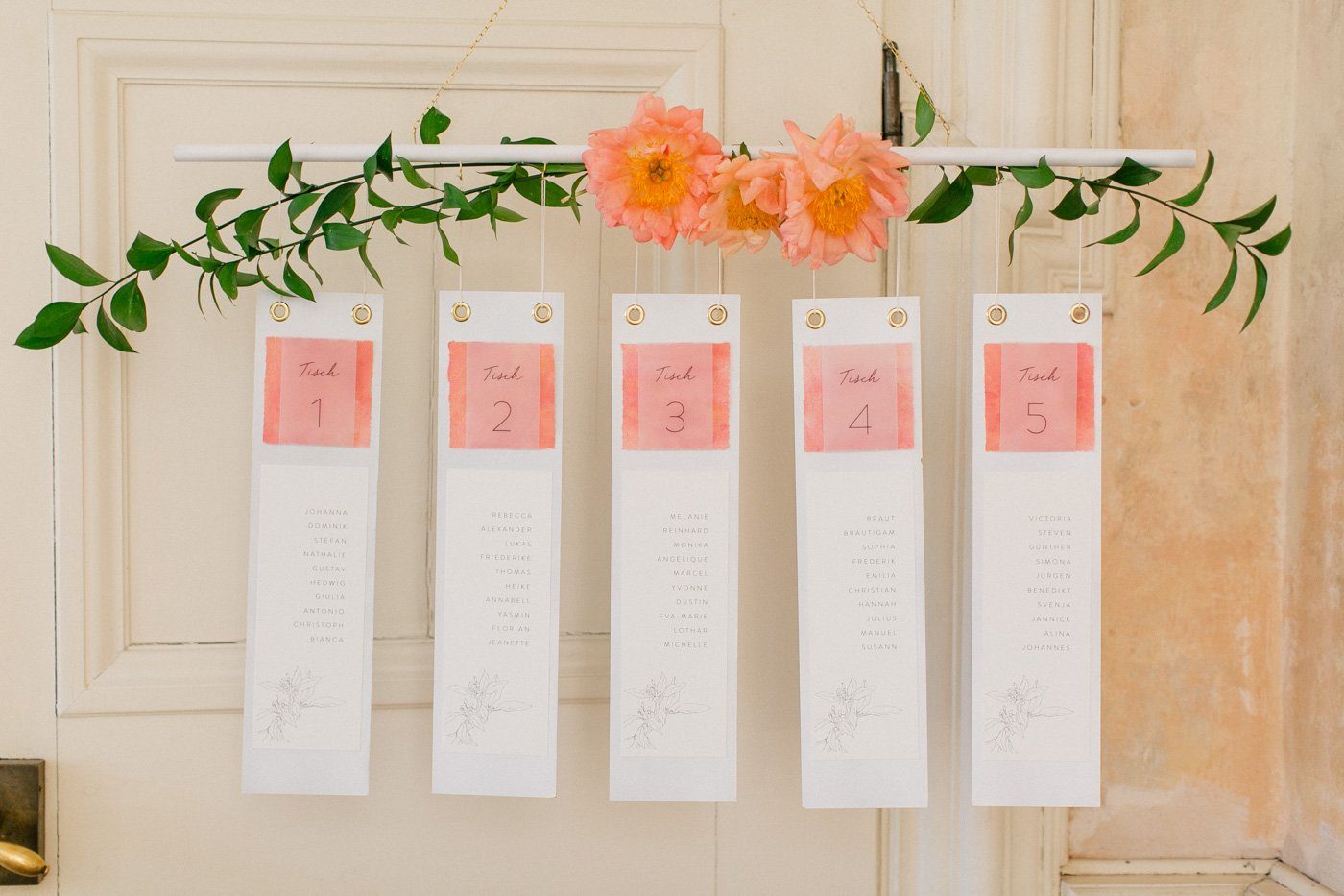 Die Farbe Grapefruit findet sich in den Tischblumen, der Papeterie, den Gastgeschenken und den Namensschildern wieder. Die Candybar ist dekoriert mit farblich passenden Papierfächern. Die Planung und Umsetzung der Dekoration lag für das Styled Shoot in den professionellen Händen von Melanie Halle Eventdesign.