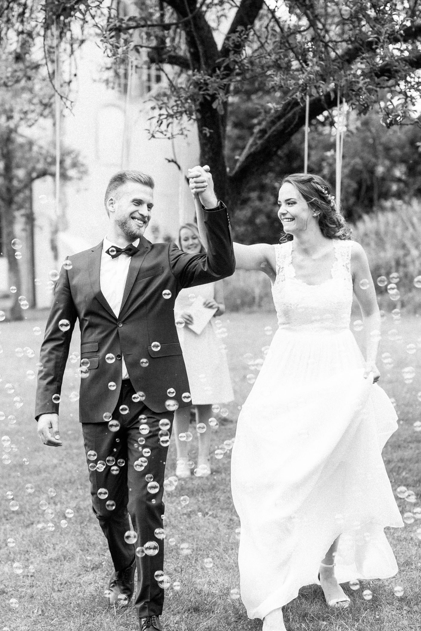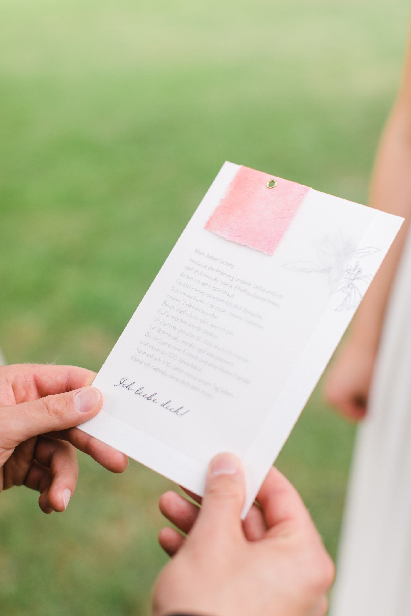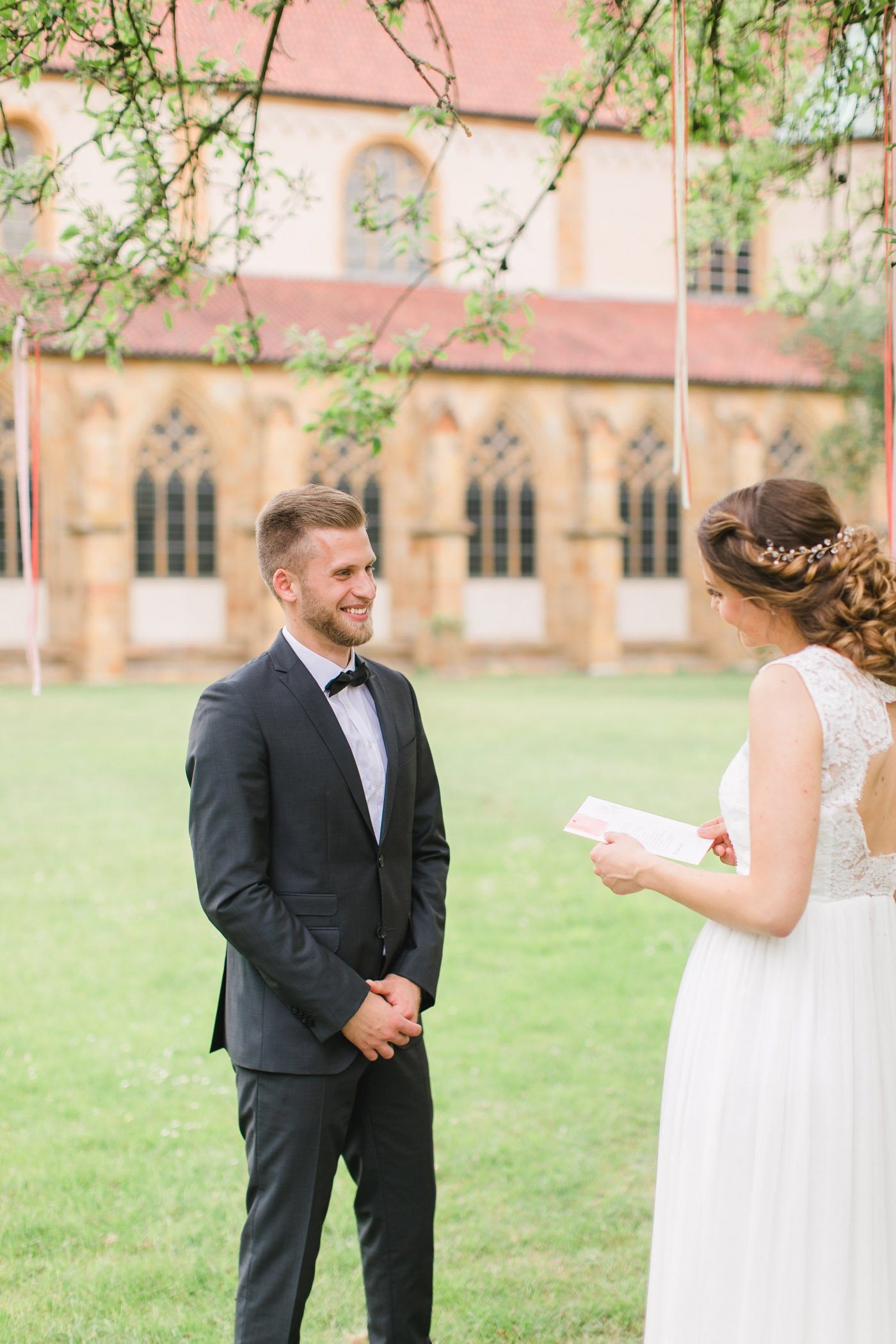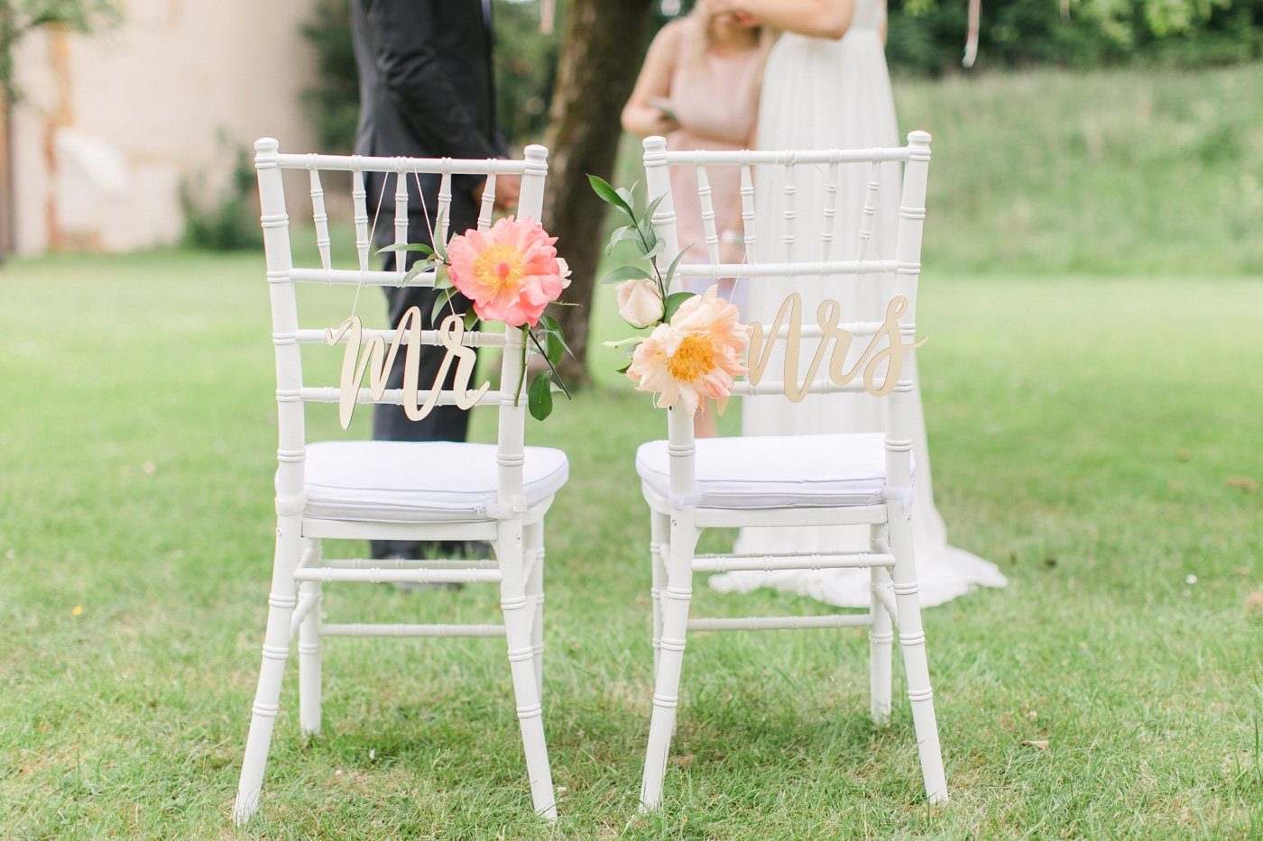 Die Traurednerin von Herzzeilen führt das Brautpaar durch die Trauung. Mit Mr- und Mrs-Schildern aus hellem Holz und einzelnen großen Pfingstrosen sind die weißen Stühle des Brautpaares stilvoll dekoriert. Mit den farblich passenden Klostermauern im Hintergrund wird das Brautpaar standesgemäß im Freien getraut.