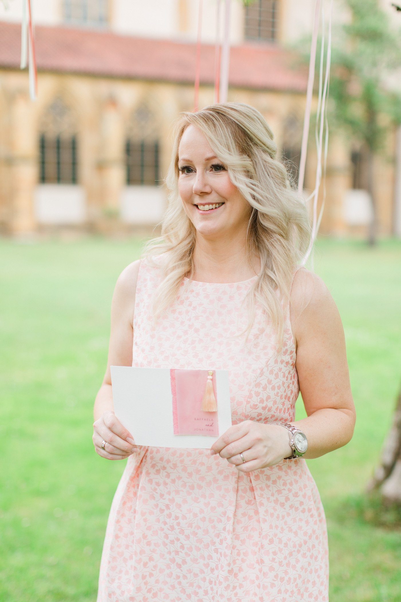 Im großen Garten der Klosterpforte hat das Team die Trauung unter einem großen Baum in Szene gesetzt. Dekoriert mit leichten rosa und korall farbenen Bändern dekoriert dient der Baum nicht nur als Schattenspender an diesem heißen Tag, sondern auch selbst als Deko-Element.