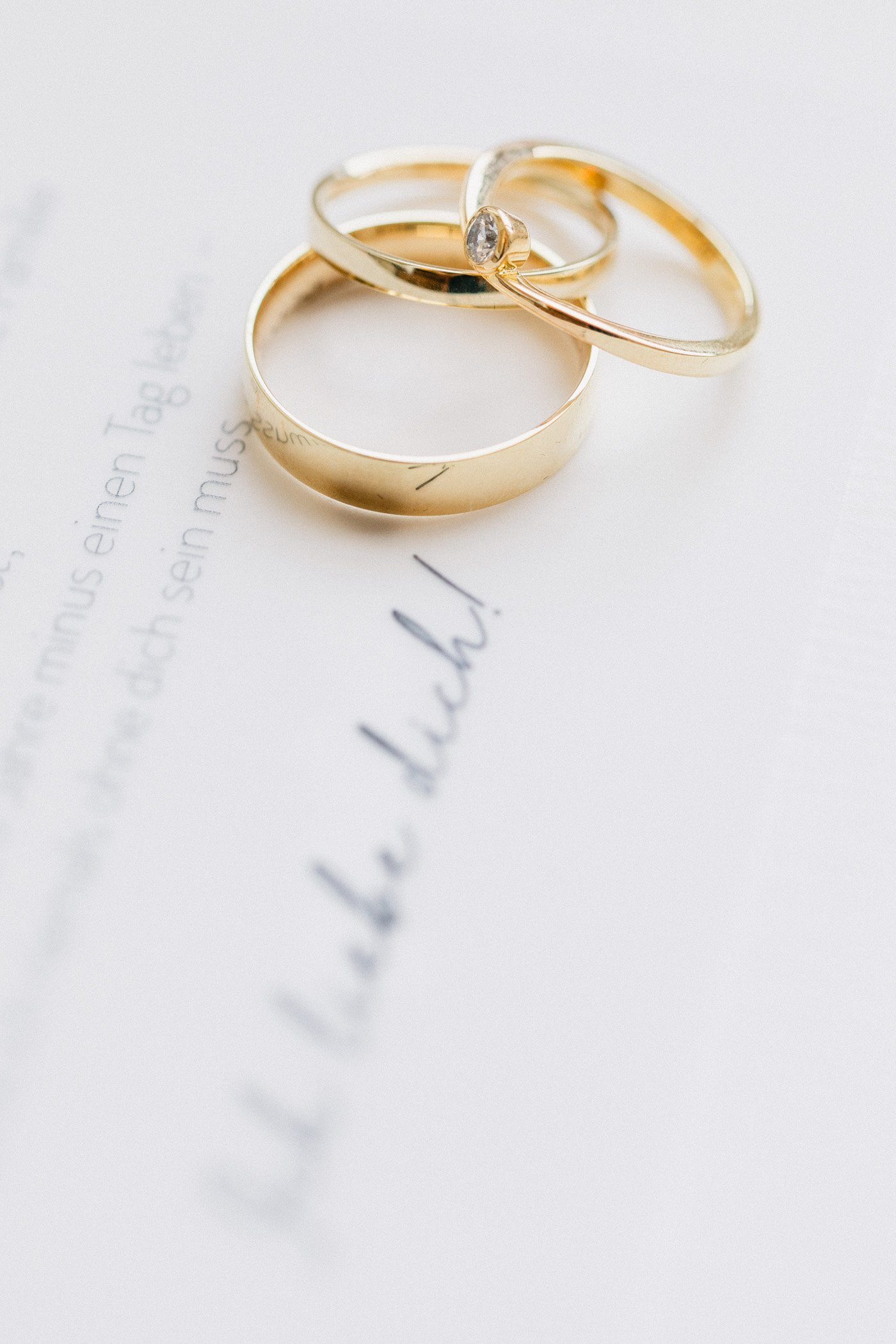 Die Trauringe und Verlobungsring mit Brilliant von Iris Menze Trauringe sind farblich passend schlicht in Gelbgold gehalten.