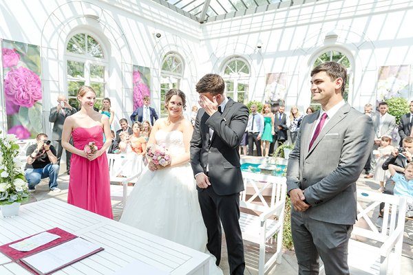 Fotos: Nicole Mattinger Fotografie | Brautkleid: Pronovias | Anzug: Hugo Boss | Brautjungfern: David´s Bridal | Location: Golfhotel Lindenburg | Standesamt: Palmengarten Frankfurt