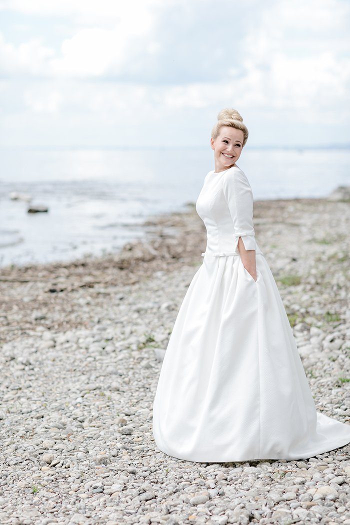 Das Brautkleid der Marke Aire Barcelona ist ein echter Hingucker. Ein Couture Kleid aus edlem Piqué Stoff mit Dreiviertel Ärmeln, einem tief sitzenden Ballonrock und Taschen! Absolut hinreißend und elegant!