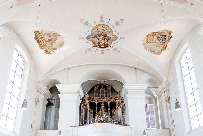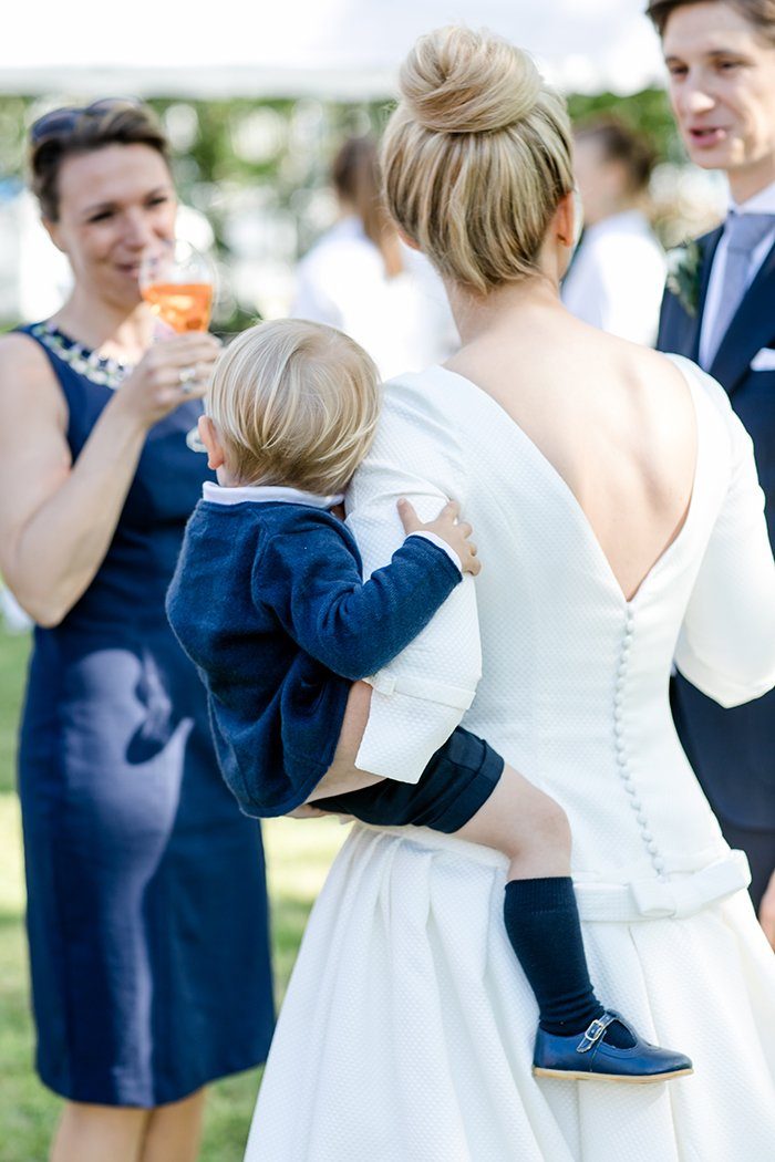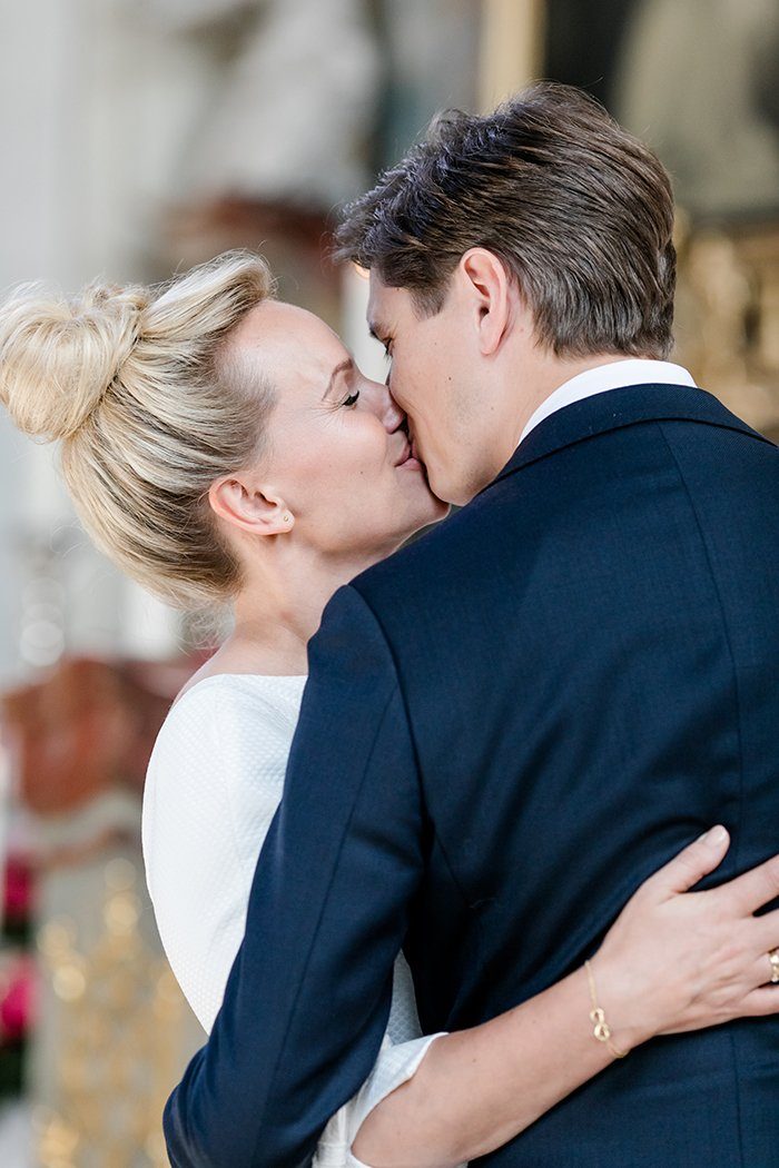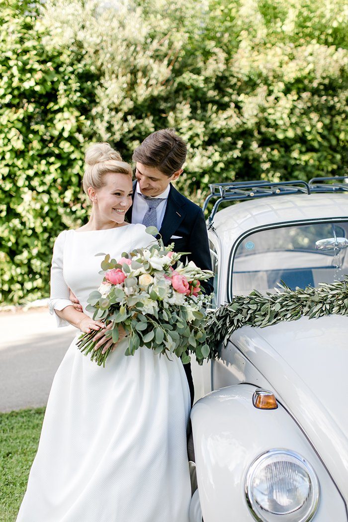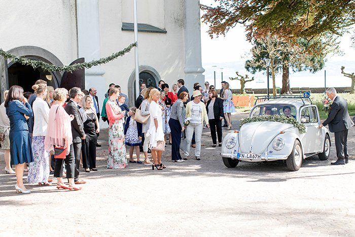Das Paar traf sich zum ‘First Look’ nicht in der Kirche, sondern am Seeufer. Ein stiller Moment, den beide mit ihrem Söhnchen in vollen Zügen genießen konnten, ganz ohne den Hochzeitstrubel drumherum. Nach dem Portraitshooting ging es im coolen Hochzeitskäfer zur Kirche.