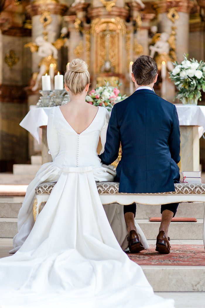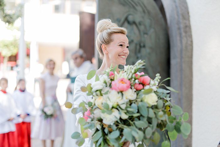 Dort wartete eine besondere Überraschung, denn die Gäste hatten die Blumen für den Brautstrauß mitgebracht. Zwei Floristinnen warteten vor der Kirche, nahmen die Blumen in Empfang und banden just in time den Strauß. Was für eine tolle Idee!