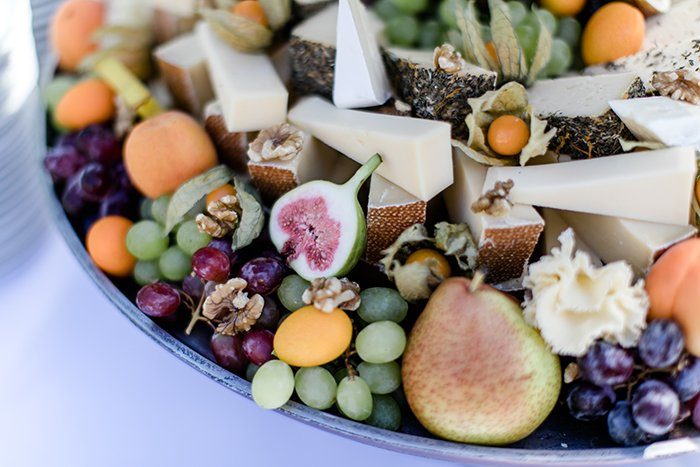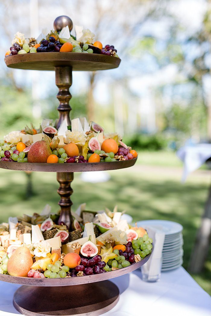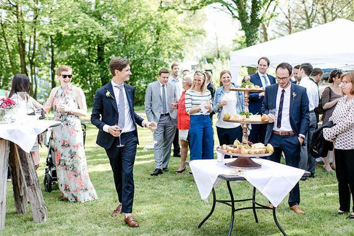 Bei schönstem Sonnenschein traf sich die Gesellschaft zum Empfang und der Feier im Landhaus Malereck Langenargen. Ein ausgelassener Nachmittag im luftigen Schatten der Bäume sollte es sein. Zum Empfang gab es, nicht wie üblich Kuchen, sondern eine leckere Käseetagère mit frischem Ost. Dazu ein kühles Getränk – lecker!