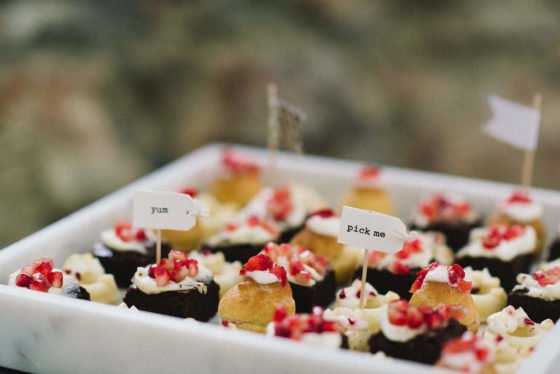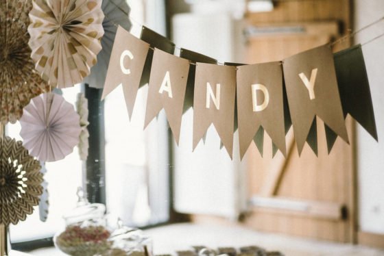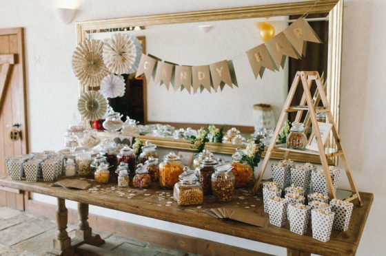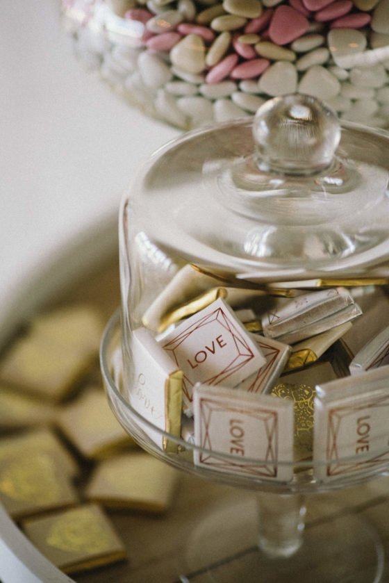 Auch für eine trendige Candy-Bar sorgte das Brautpaar, die mit vielen Dekorations-Details wie gold gepunkteten Popcorn-Bechern ins Gesamtbild passte. Und ein besonderer Eye-Catcher war natürlich die Hochzeitstorte im Naked-Look.