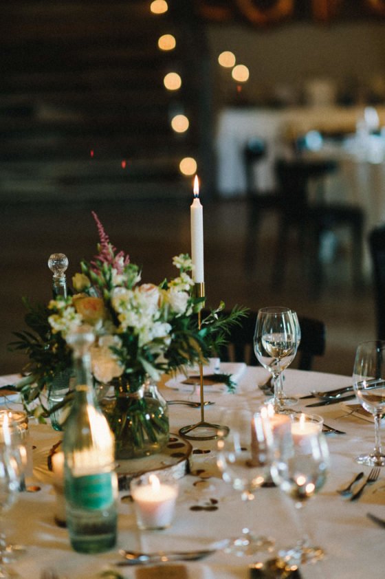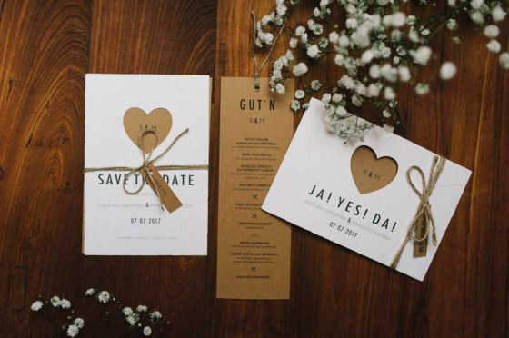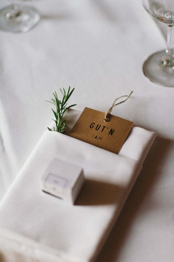 Bei den Menükarten griff das Brautpaar wie schon bei ihren Einladungen den rustikal eleganten Stil wieder auf. Die Papeterie mit weißem Papier und Kraftpapier ergänzte die Dekoration der Location.
