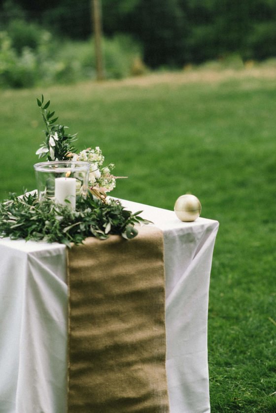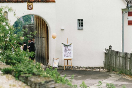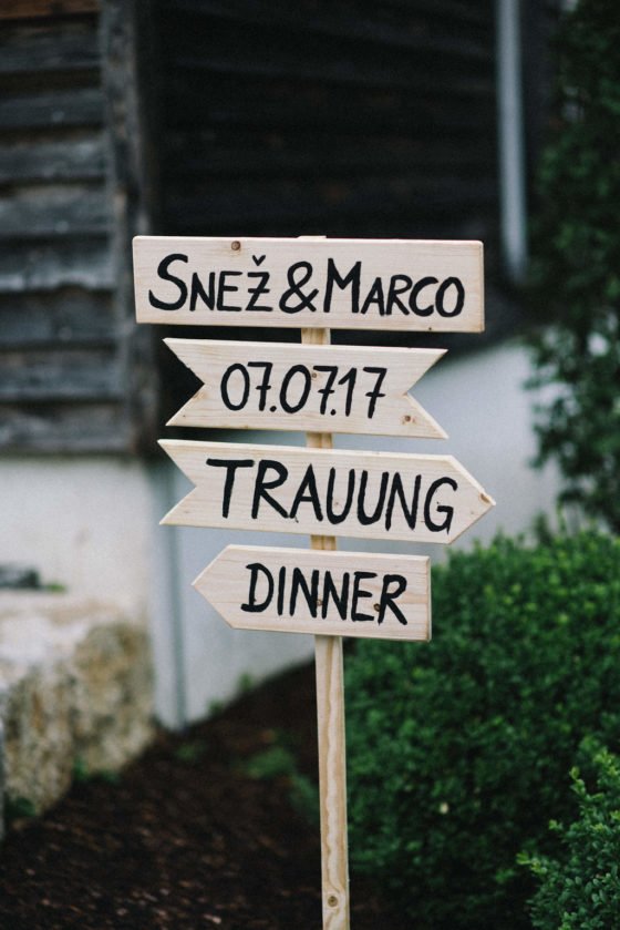 Zwei besondere Details rundeten das Bild der Trauung ab: Zum einen die goldene Ringkugel, in der Snez und Marco ihre Eheringen aufbewahrten und bei der Trauung stilvoll präsentierten. Den Weg zum Trauungsort wies den Gästen ein selbstbemaltes Holzschild.