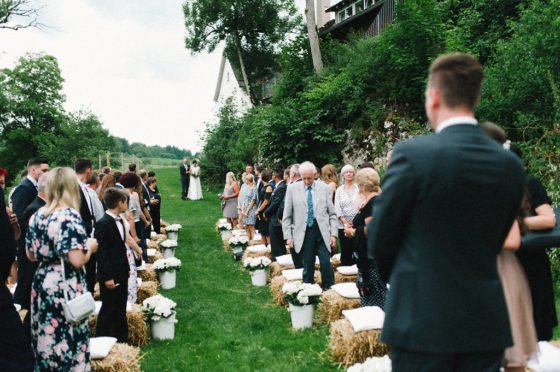 Die ländliche Umgebung griff das Brautpaar auch bei den Sitzgelegenheiten für ihre Gäste während der Trauung auf: Die Gäste saßen auf Heuballen!