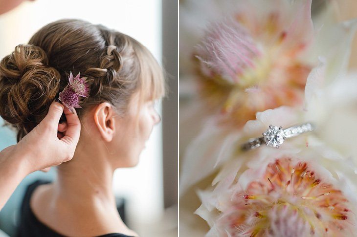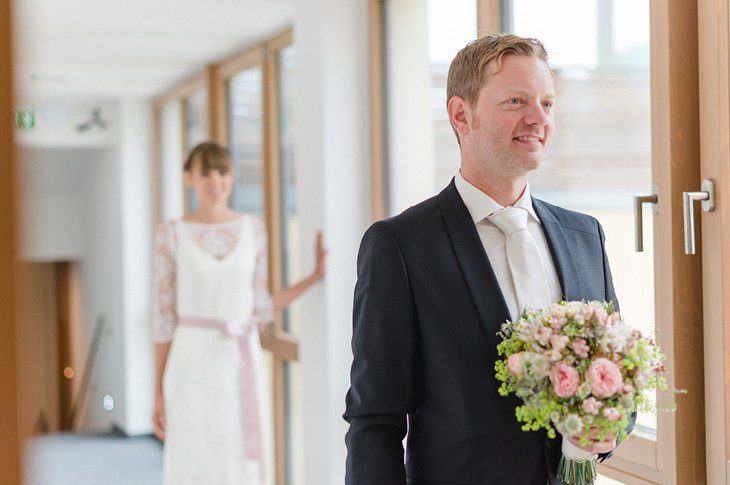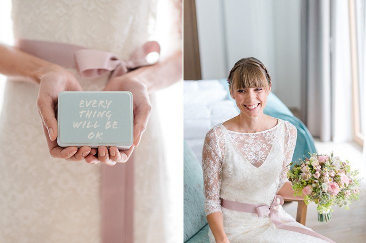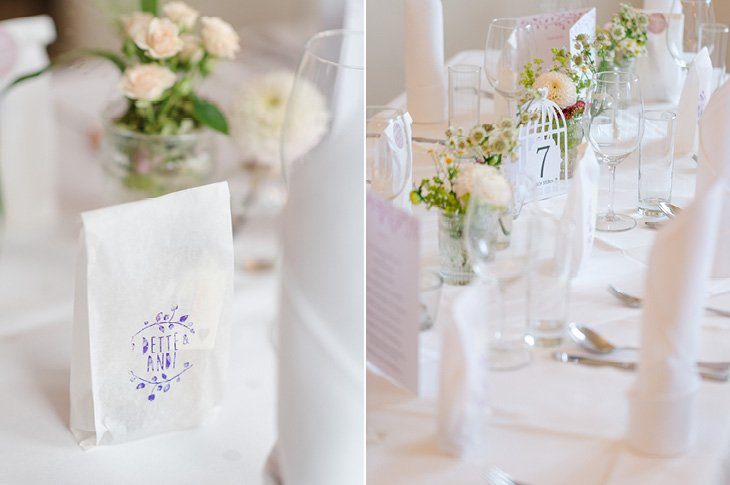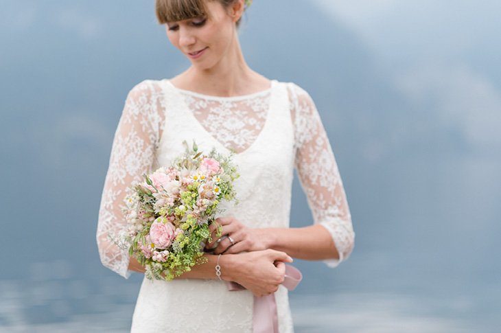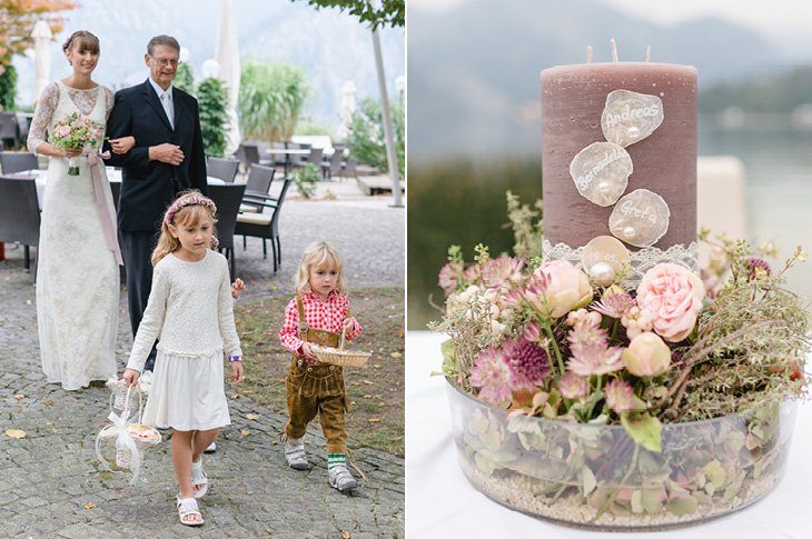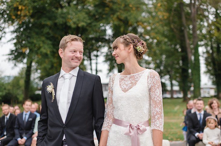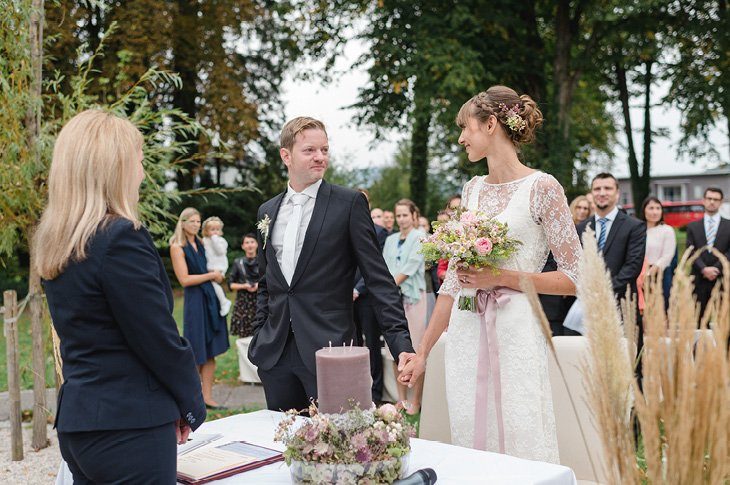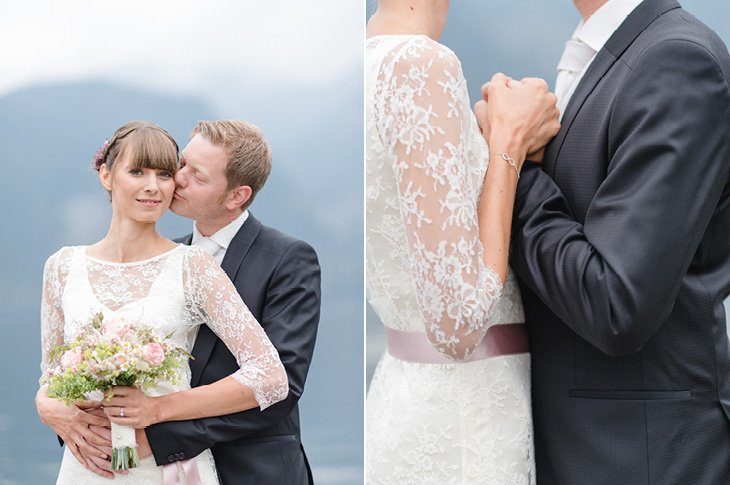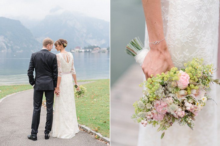 Ein zarter Hauch Romantik durchwehte die Spitzvilla am Traunsee, die die beiden für ihre Feier als Location ausgesucht hatten. Die süße Papeterie mit lila Vintage Elementen passte hervorragend zum filigranen Brautstrauß von Bernadette und ihrem schlicht geschnittenen, aber perfekt sitzendem Spitzenkleid mit 3/4 Ärmeln. Super schön und elegant für den Herbst!
