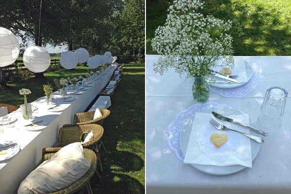 Etwas abseits steht eine lange Tafel. Wiesenblumen in sommerlich-frischen Tönen, die auch schon die Stühle bei der Trauung geschmückt haben, verleihen dem Tisch Leben und Farbe. Es wird gegessen, getrunken, geredet – einfach genossen. Man hört Kinder lachen. Sie sitzen auf mit Blumen geschmückten Baumschaukeln und lassen sich die Haare aus dem Gesicht wehen. Die Mädchen flechten Blumenkränze, die Jungs bauen aus Hölzern Schiffchen für den See.