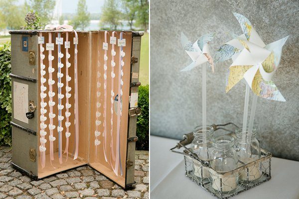 Bei einem Brautpaar, das gerne reist, können das z. B. alte Koffer, in denen der Sitzplan untergebracht ist, ein Globus, der die Candy Bar schmückt oder Stadtpläne, die man für die Papeterie verwenden kann, sein.