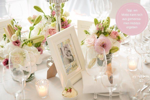 Um ein Motto zu finden, kann man sich z. B. überlegen, ob man ein gemeinsames Hobby hat, ob man sich an die Jahreszeit oder seiner Lieblingsfarbe orientiert oder ob man die Faszination für eine Stadt oder ein Land teilt. Dann kann man wunderbar Elemente zu dem Thema einfließen lassen.