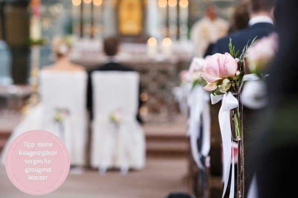 Man sollte unbedingt darauf achten, dass man keine empfindlichen Blumen wählt, da diese bei den hohen Temperaturen sonst schnell den Kopf hängen lassen können. Außerdem sollten die Blumen natürlich genug Wasser bekommen. So kann man zum Beispiel für die Blumen an den Kirchenbänken kleine, mit Wasser gefüllte Reagenzgläser verwenden. Diese sehen übrigens auch sehr hübsch aus, wenn man einzelne Blumen darin dekoriert und Bäume damit schmückt. Farblich passende Bänder runden die Dekoration ab und flattern luftig leicht im Wind.