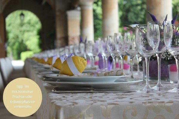 Wer ganz sicher gehen will, kann für seine Dekoration Alternativen wie Früchte oder Kräuterpflanzen verwenden. Zitronen geben z. B. einen wunderbaren Farbklecks und verleihen ein mediterranes Flair. Aber auch mit Lavendel-, Oliven- oder Rosmarinpflänzchen in schönen Töpfen lassen sich wundervolle Hochzeitsdekorationen gestalten. Und wenn man möchte, hat man auch gleich ein Gastgeschenk, das Freunde und Verwandte als Erinnerung mit nach Hause nehmen können.