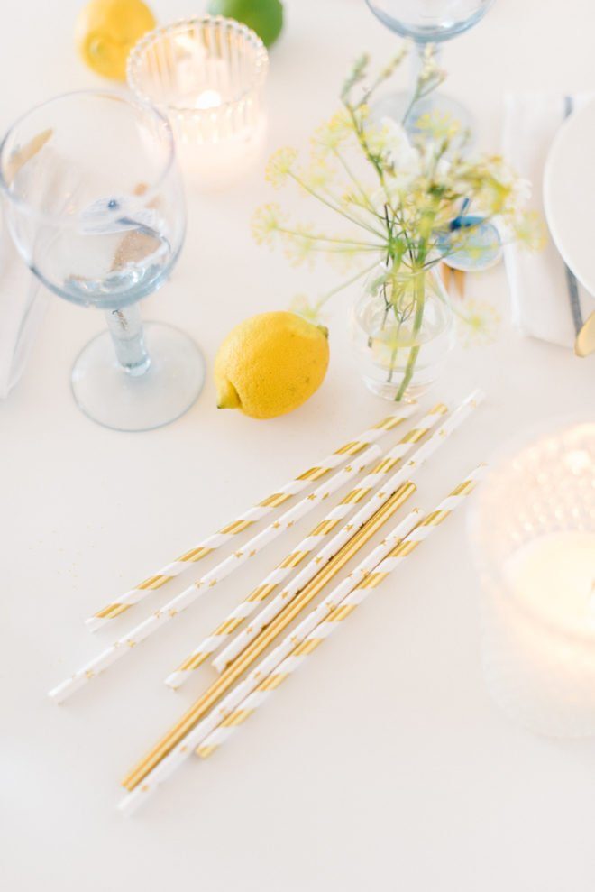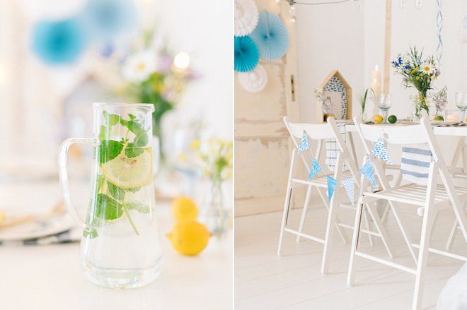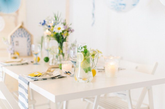 Zitronen und Limetten sind die einfachste Art der Deko einen sommerlichen Touch zu geben. Auf dem Tisch verteilen und schön ist. Gebt ein paar Scheiben in eine Glaskaraffe. Mit einem Zweig Minze und ein paar Scheiben Ingwer wird daraus ein erfrischendes, alkoholfreies Getränk!