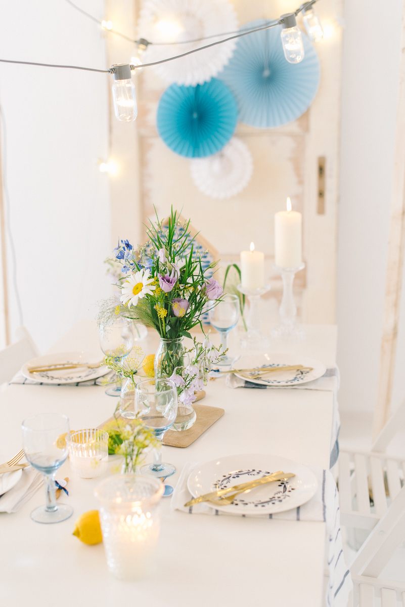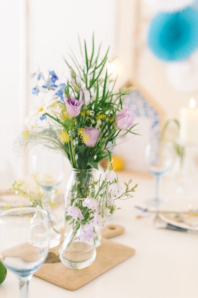 Lässig, locker, unkompliziert und fröhlich. So sollte der Tag mit guten Freunden sein! Bunte Wiesenblumen, die uns Blume 2000.de zur Verfügung gestellt hat, gruppierten sich in unterschiedlich großen Vasen auf dem Tisch. Der wilde Fenchel, das ist das großflächige, filigrane gelbe Gewächs, duftete herrlich. Die Blumen sind eigentlich klassisch in einem Wiesenzauber Strauß gebunden, für unseren Zweck habe ich ihn aber zerlegt und in verschiedenen Vasen angeordnet.