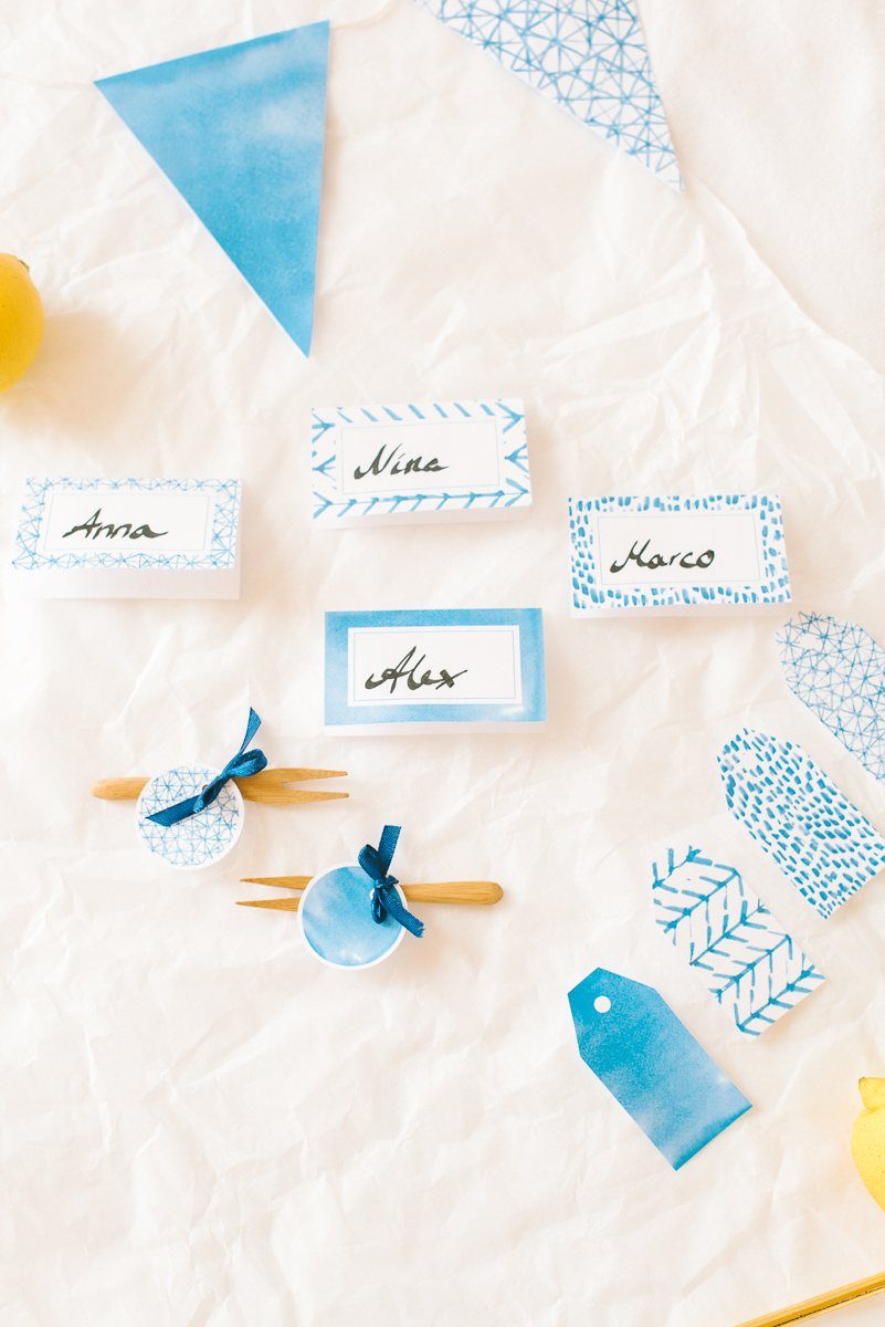 Blautöne im angesagten Wasserfarben Look sind das Hauptaugenmerk dieser Serie. In der PDF Datei findet Ihr eine Wimpelkette, Namensschilder zum Aufstellen, runde Anhänger, Hangtags und Schildchen zum Ausdrucken. Einfach ausschneiden und damit Euren Sommertisch verwöhnen. Zum Download gehts hier entlang: Sommerfrische Papeterie