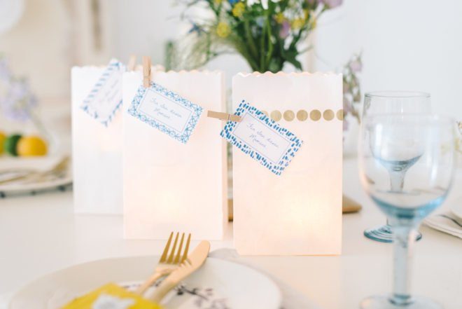 Neben Kerzen sorgen Lichttüten für hübsche Akzente auf den Tischen oder Wegen zur Location. Unsere Papierlichttüten sind aus schwer entflammbaren Papier und lassen sich bestempeln oder bekleben – perfekt um den Stil des Fests aufzugreifen. Wir haben einfach goldenes Tasking Tape darauf geklebt.