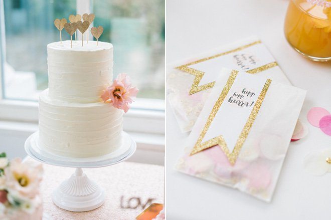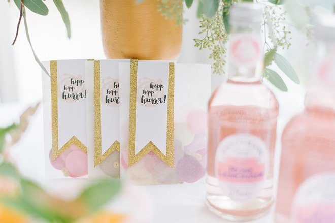 Die kleinen Konfetti Tütchen sind ebenfalls ein easy-peasy Do-it-yourself. Einfach Seidenpapier Konfetti in der Wunschfarbe in eine transparente Papiertüte einfüllen, wir haben noch ein paar goldenen Pailletten hinzu gemischt, und mit einem selbst ausgeschnittenen Wimpel verschließen. Es könnte allerdings passieren, dass die Gäste sie nicht werfen, weil sie viel zu schön sind und lieber als Andenken aufgehoben werden :-)
