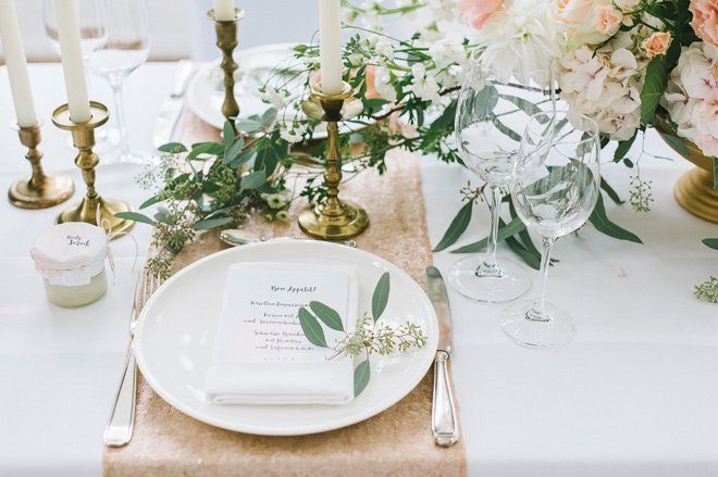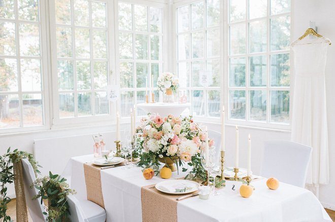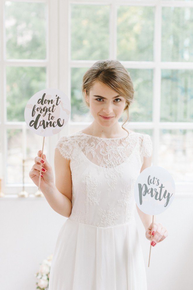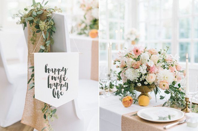 Mit einem opulenten und dennoch filigran wirkenden Blumenarrangement hat Nelly von Stil(l)leben Deko unsere Augen zum Leuchten gebracht. Wie schön die pastellfarbenen Hortensien, Rosen und Dahlien mit den Eukalyptuszweigen wirken! Ein paar herrlich duftende gelbe Pfirsiche tummeln sich zwischen den Plätzen. Der Hochzeitswimpel ‘Happy Wife, happy Life’ hängt locker am Platz des Bräutigams. Nomen est Omen, nicht wahr?! Die Photo Booth Schilder ‘Let’s Party’ und ‘Don’t forget to dance’ könnt Ihr übrigens selbst ausdrucken und mehrfach verwenden.